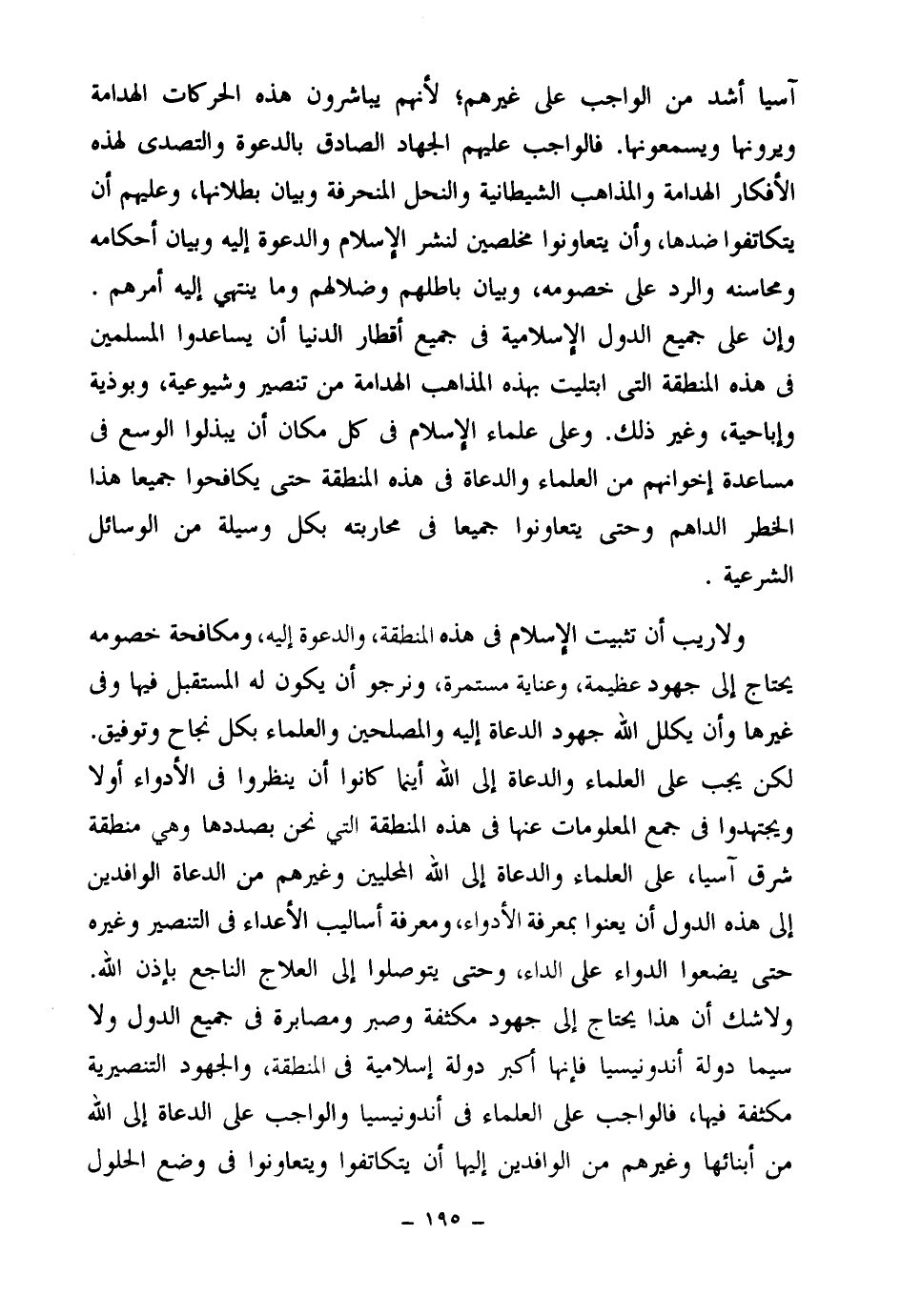 آسيا أشد من الواجب على غيرهم؛ لأنهم يباشرون هذه الحركات الهدامة ويرونها ويسمعونها. فالواجب عليهم الجهاد الصادق بالدعوة والتصدي لهذه الأفكار الهدامة والمذاهب الشيطانية والنحل المنحرفة وبيان بطلانها، وعليهم أن يتكاتفوا ضدها وأن يتعاونوا مخلصين لنشر الإسلام والدعوة إليه وبيان أحكامه ومحاسنه والرد على خصومه، وبيان باطلهم وضلالهم وما ينتهي إليه أمرهم.