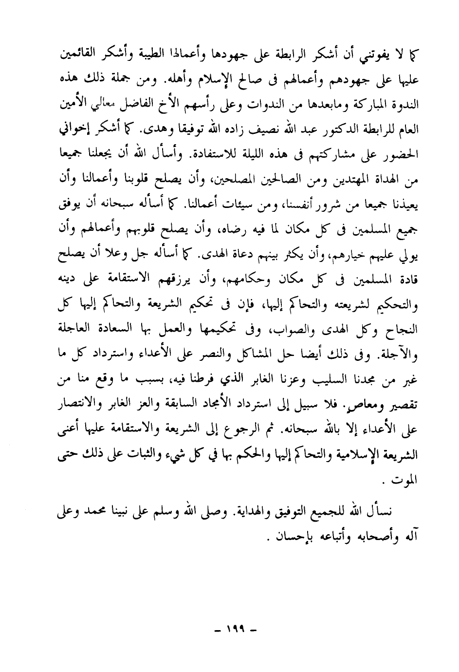 كما لا يفوتني أن أشكر الرابطة على جهودها وأعمالها الطيبة وأشكر القائمين عليها على جهودهم وأعمالهم في صالح الإسلام وأهله. ومن جملة ذلك هذه الندوة المباركة وما بعدها من الندوات وعلى رأسهم الأخ الفاضل معالي الأمين العام للرابطة الدكتور عبد الله نصيف زاده الله توفيقا وهدى. كما أشكر إخواني الحضور على مشاركتهم في هذه الليلة للاستفادة.