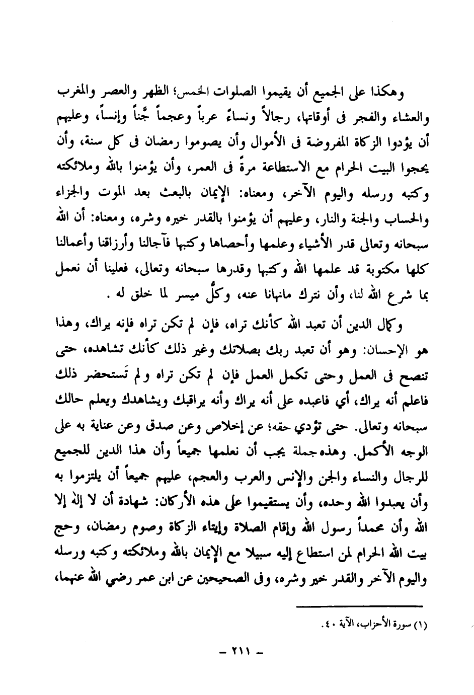 وهكذا على الجميع أن يقيموا الصلوات الخمس الظهر والعصر والمغرب والعشاء والفجر في أوقاتها، رجالا ونساءا عربا وعجما جنا وإنسا، وعليهم أن يؤدوا الزكاة المفروضة في الأموال وأن يصوموا رمضان في كل سنة، وأن يحجوا البيت الحرام مع الاستطاعة مرة في العمر، وأن يؤمنوا بالله وملائكته وكتبه ورسله واليوم الآخر، ومعناه: الإيمان بالبعث بعد الموت والجزاء والحساب والجنة والنار، وعليهم أن يؤمنوا بالقدر خيره وشره، ومعناه: أن الله سبحانه وتعالى قدر الأشياء وعلمها وأحصاها وكتبها فآجالنا وأرزاقنا وأعمالنا كلها مكتوبة قد علمها الله وكتبها وقدرها سبحانه وتعالى، فعلينا أن نعمل بما شرع الله لنا وأن نترك ما نهانا عنه، وكل ميسر لما خلق له.