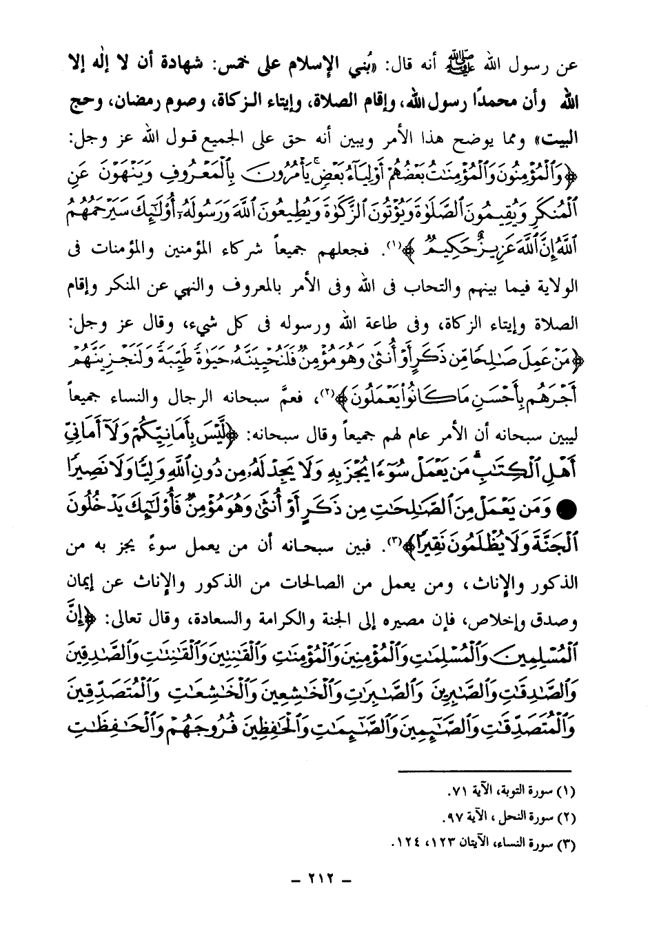 عن رسول الله صلى الله عليه وسلم أنه قال: «بني الإسلام على خمس شهادة أن لا إله إلا الله وأن محمدا رسول الله وإقام الصلاة وإيتاء الزكاة وصوم رمضان وحج البيت (¬1) » ومما يوضح هذا الأمر ويبين أنه حق على الجميع قول الله عز وجل: {وَالْمُؤْمِنُونَ وَالْمُؤْمِنَاتُ بَعْضُهُمْ أَوْلِيَاءُ بَعْضٍ يَأْمُرُونَ بِالْمَعْرُوفِ وَيَنْهَوْنَ عَنِ الْمُنْكَرِ وَيُقِيمُونَ الصَّلَاةَ وَيُؤْتُونَ الزَّكَاةَ وَيُطِيعُونَ اللَّهَ وَرَسُولَهُ أُولَئِكَ سَيَرْحَمُهُمُ اللَّهُ إِنَّ اللَّهَ عَزِيزٌ حَكِيمٌ} (¬2)