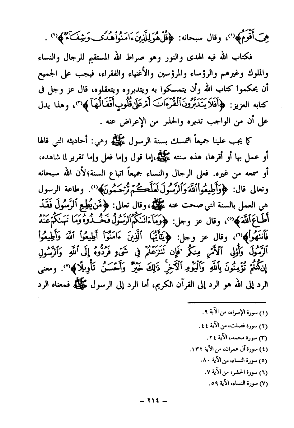 فكتاب الله فيه الهدى والنور وهو صراط الله المستقيم للرجال والنساء والملوك وغيرهم والرؤساء والمرؤسين والأغنياء والفقراء، فيجب على الجميع أن يحكموا كتاب الله وأن يتمسكوا به ويتدبروه ويتعقلوه، قال عز وجل في كتابه العزيز: {أَفَلَا يَتَدَبَّرُونَ الْقُرْآنَ أَمْ عَلَى قُلُوبٍ أَقْفَالُهَا} (¬2) وهذا يدل على أن من الواجب تدبره والحذر من الإعراض عنه.