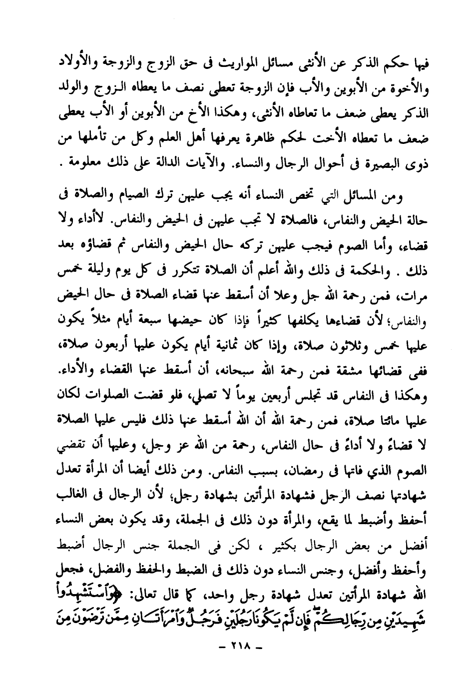 ومن ذلك أيضا أن المرأة تعدل شهادتها نصف الرجل فشهادة المرأتين بشهادة رجل؛ لأن الرجال في الغالب أحفظ وأضبط لما يقع، والمرأة دون ذلك في الجملة، وقد يكون بعض النساء أفضل من بعض الرجال بكثير، لكن في الجملة جنس الرجال أضبط وأحفظ وأفضل، وجنس النساء دون ذلك في الضبط والحفظ والفضل، فجعل الله شهادة المرأتين تعدل شهادة رجل واحد، كما قال تعالى: