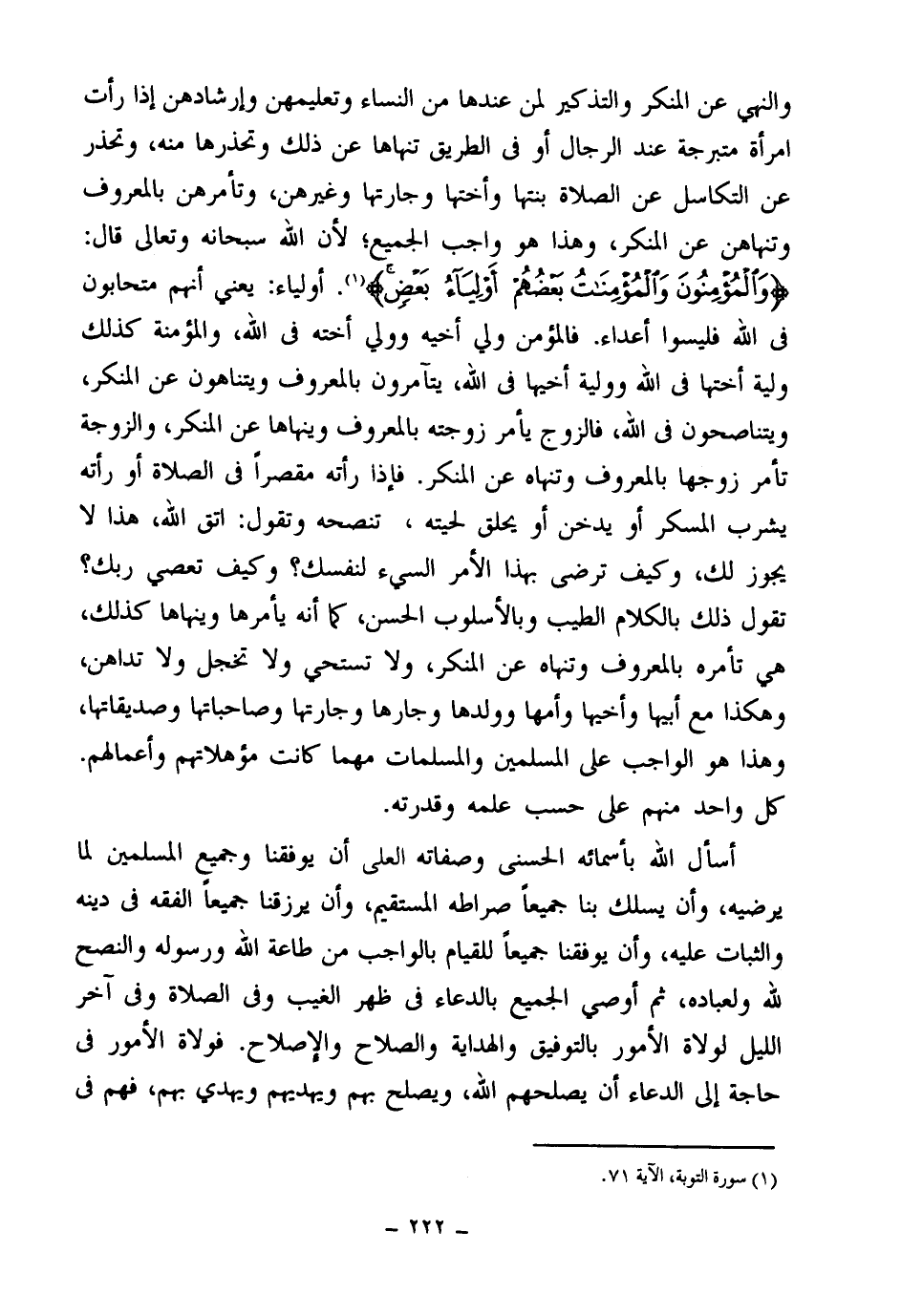 والنهي عن المنكر والتذكير لمن عندها من النساء وتعليمهن وإرشادهن إذا رأت امرأة متبرجة عند الرجال أو في الطريق تنهاها عن ذلك وتحذرها منه، وتحذر عن التكاسل عن الصلاة بنتها وأختها وجارتها وغيرهن، وتأمرهن بالمعروف وتنهاهن عن المنكر، وهذا هو واجب الجميع؛ لأن الله سبحانه وتعالى قال: {وَالْمُؤْمِنُونَ وَالْمُؤْمِنَاتُ بَعْضُهُمْ أَوْلِيَاءُ بَعْضٍ} (¬1) أولياء: يعني أنهم متحابون في الله فليسوا أعداء. فالمؤمن ولي أخيه وولي أخته في الله، والمؤمنة كذلك ولية أختها في الله وولية أخيها في الله، يتآمرون بالمعروف ويتناهون عن المنكر، ويتناصحون في الله، فالزوج يأمر زوجته بالمعروف وينهاها عن المنكر، والزوجة تأمر زوجها بالمعروف وتنهاه عن المنكر. فإذا رأته مقصرا في الصلاة أو رأته يشرب المسكر أو يدخن أو يحلق لحيته- تنصحه وتقول: اتق الله، هذا لا يجوز لك، وكيف ترضى بهذا الأمر السيء لنفسك؟ وكيف تعصي ربك؟ تقول ذلك بالكلام الطيب وبالأسلوب الحسن، كما أنه يأمرها وينهاها كذلك، هي تأمره بالمعروف وتنهاه عن المنكر، ولا تستحي ولا تخجل ولا تداهن، وهكذا مع أبيها وأخيها وأمها وولدها وجارها وجارتها وصاحباتها وصديقاتها، وهذا هو الواجب على المسلمين والمسلمات مهما كانت مؤهلاتهم وأعمالهم. كل واحد منهم على حسب علمه وقدرته.
