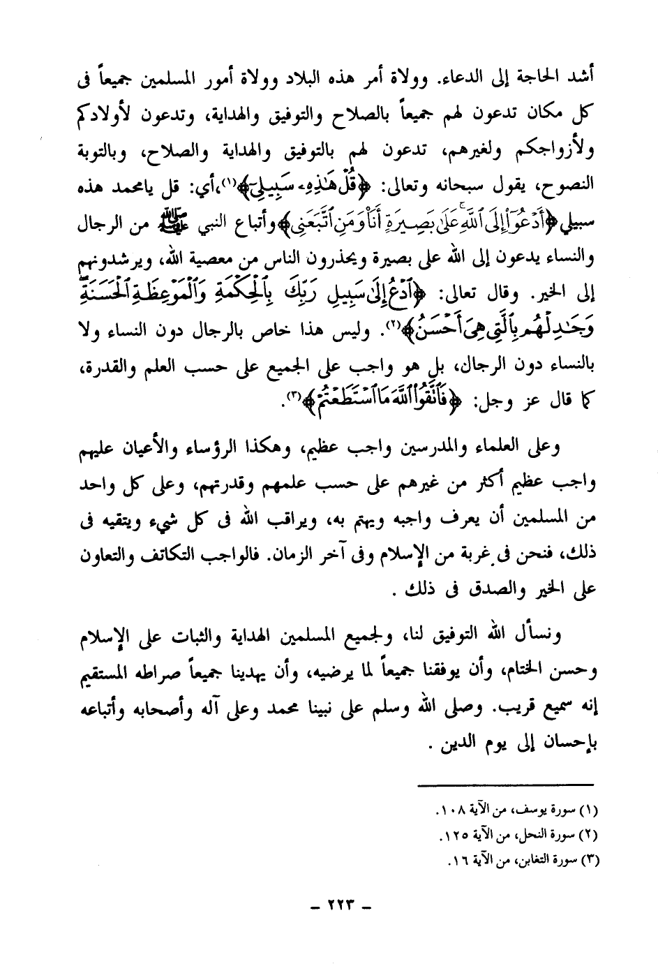 أشد الحاجة إلى الدعاء. وولاة أمر هذه البلاد وولاة أمور المسلمين جميعا في كل مكان تدعون لهم جميعا بالصلاح والتوفيق والهداية، وتدعون لأولادكم ولأزواجكم ولغيرهم، تدعون لهم بالتوفيق والهداية والصلاح، وبالتوبة النصوح، يقول سبحانه وتعالى: {قُلْ هَذِهِ سَبِيلِي} (¬1) أي: قل يا محمد هذه سبيلي أدعو إلى الله على بصيرة أنا ومن اتبعني. وأتباع النبي صلى الله عليه وسلم من الرجال والنساء يدعون إلى الله على بصيرة ويحذرون الناس من معصية الله، ويرشدونهم إلى الخير. وقال تعالى: {ادْعُ إِلَى سَبِيلِ رَبِّكَ بِالْحِكْمَةِ وَالْمَوْعِظَةِ الْحَسَنَةِ وَجَادِلْهُمْ بِالَّتِي هِيَ أَحْسَنُ} (¬2) وليس هذا خاص بالرجال دون النساء ولا بالنساء دون الرجال، بل هو واجب على الجميع على حسب العلم والقدرة، كما قال عز وجل: {فَاتَّقُوا اللَّهَ مَا اسْتَطَعْتُمْ} (¬3)