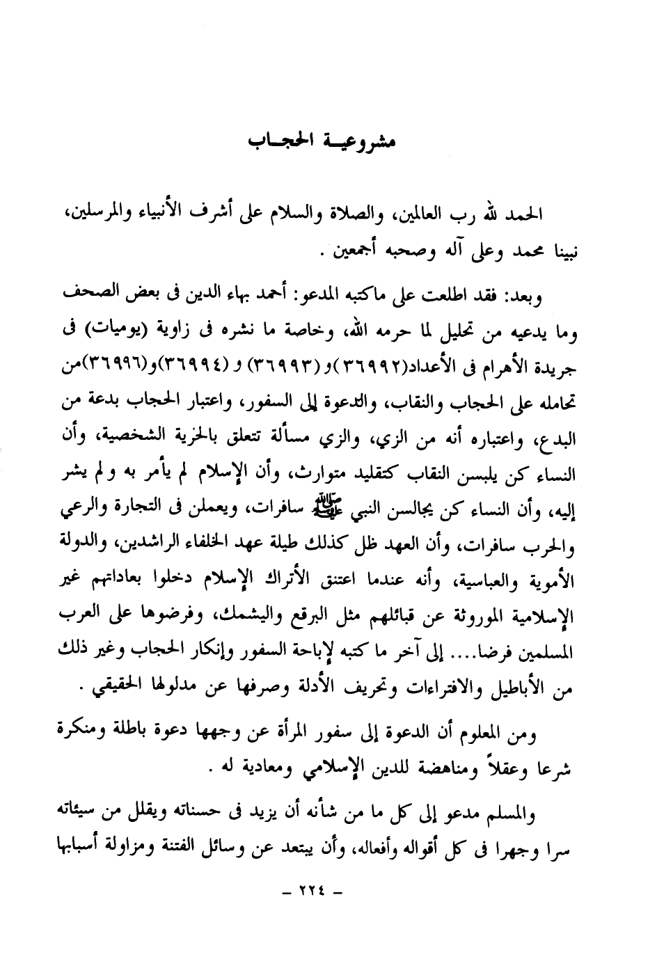 الحمد لله رب العالمين، والصلاة والسلام على أشرف الأنبياء والمرسلين، نبينا محمد وعلى آله وصحبه أجمعين. وبعد: فقد اطلعت على ما كتبه المدعو: أحمد بهاء الدين في بعض الصحف وما يدعيه من تحليل لما حرمه الله، وخاصة ما نشره في زاوية (يوميات) في جريدة الأهرام في الأعداد 36992 -36993- 36994 و 36996 من تحامله على الحجاب والنقاب، والدعوة إلى السفور، واعتبار الحجاب بدعة من البدع، واعتباره أنه من الزي، والزي مسألة تتعلق بالحرية الشخصية، وأن النساء كن يلبسن النقاب كتقليد متوارث، وأن الإسلام لم يأمر به ولم يشر إليه، وأن النساء كن يجالسن النبي صلى الله عليه وسلم سافرات، ويعملن في التجارة والرعي والحرب سافرات، وأن العهد ظل كذلك طيلة عهد الخلفاء الراشدين، والدولة الأموية والعباسية، وأنه عندما اعتنق الأتراك الإسلام دخلوا بعاداتهم غير الإسلامية الموروثة عن قبائلهم مثل البرقع واليشمك، وفرضوها على العرب المسلمين فرضا. إلى آخر ما كتبه لإباحة السفور وإنكار الحجاب وغير ذلك من الأباطيل والافتراءات وتحريف الأدلة وصرفها عن مدلولها الحقيقي.