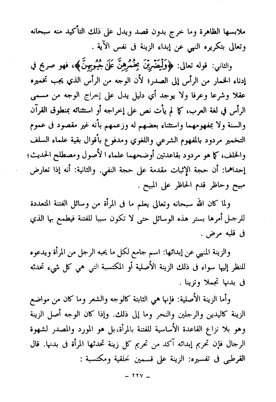 وأما الزينة الأصلية: فإنها هي الثابتة كالوجه والشعر وما كان من مواضع الزينة كاليدين والرجلين والنحر وما إلى ذلك. وإذا كان الوجه أصل الزينة وهو بلا نزاع القاعدة الأساسية للفتنة بالمرأة، بل هو المورد والمصدر لشهوة الرجال فإن تحريم إبدائه آكد من تحريم كل زينة تحدثها المرأة في بدنها. قال القرطبي في تفسيره: الزينة على قسمين خلقية ومكتسبة: