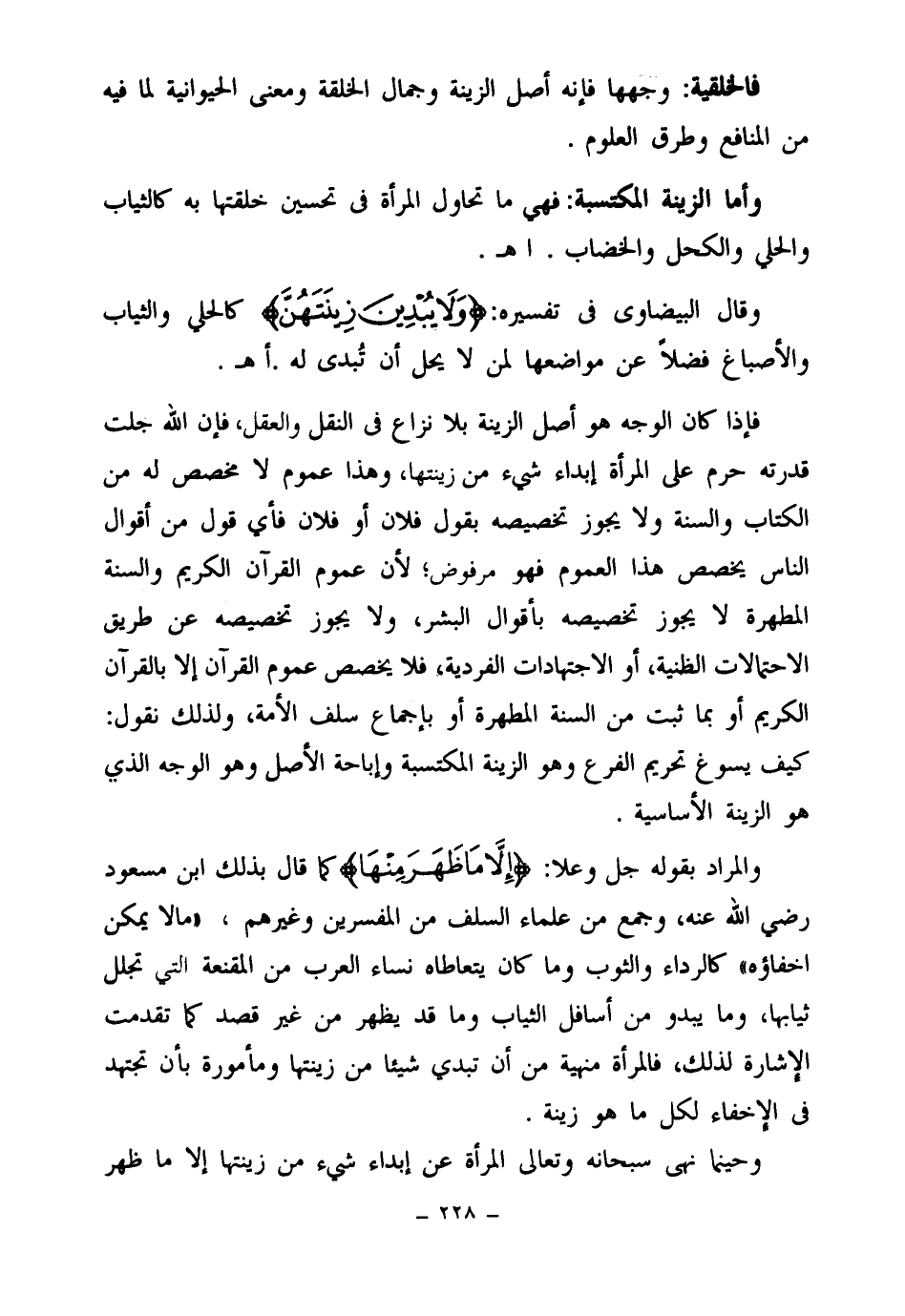 والمراد بقوله جل وعلا: {إِلَّا مَا ظَهَرَ مِنْهَا} (¬2) كما قال بذلك ابن مسعود رضي الله عنه، وجمع من علماء السلف من المفسرين وغيرهم- " ما لا يمكن اخفاؤه " كالرداء والثوب وما كان يتعاطاه نساء العرب من المقنعة التي تجلل ثيابها، وما يبدو من أسافل الثياب وما قد يظهر من غير قصد كما تقدمت الإشارة لذلك، فالمرأة منهية من أن تبدي شيئا من زينتها ومأمورة بأن تجتهد في الإخفاء لكل ما هو زينة.