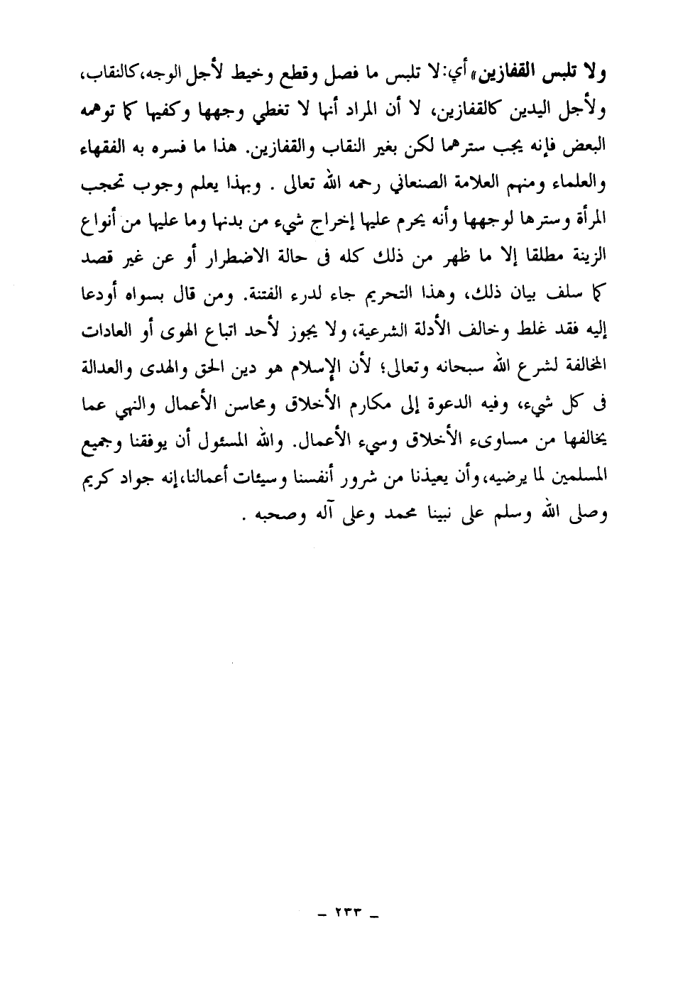 ولا تلبس القفازين (¬1) » أي لا تلبس ما فصل وقطع وخيط لأجل الوجه كالنقاب ولأجل اليدين كالقفازين، لا أن المراد أنها لا تغطي وجهها وكفيها كما توهمه البعض فإنه يجب سترهما لكن بغير النقاب والقفازين. هذا ما فسره به الفقهاء والعلماء ومنهم العلامة الصنعاني رحمه الله تعالى. وبهذا يعلم وجوب تحجب المرأة وسترها لوجهها وأنه يحرم عليها إخراج شيء من بدنها وما عليها من أنواع الزينة مطلقا إلا ما ظهر من ذلك كله في حالة الاضطرار أو عن غير قصد كما سلف بيان ذلك، وهذا التحريم جاء لدرء الفتنة. ومن قال بسواه أو دعا إليه فقد غلط وخالف الأدلة الشرعية ولا يجوز لأحد اتباع الهوى أو العادات المخالفة لشرع الله سبحانه وتعالى؛ لأن الإسلام هو دين الحق والهدى والعدالة في كل شيء، وفيه الدعوة إلى مكارم الأخلاق ومحاسن الأعمال والنهي عما يخالفها من مساوئ الأخلاق وسيء الأعمال. والله المسئول أن يوفقنا وجميع المسلمين لما يرضيه وأن يعيذنا من شرور أنفسنا وسيئات أعمالنا إنه جواد كريم وصلى الله وسلم على نبينا محمد وعلى آله وصحبه.