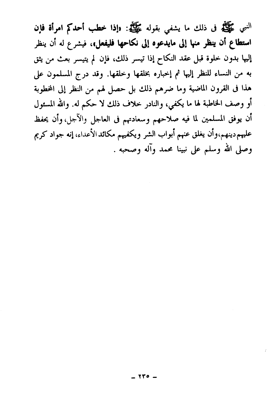 النبي صلى الله عليه وسلم في ذلك ما يشفي بقوله صلى الله عليه وسلم: «إذا خطب أحدكم امرأة فإن استطاع أن ينظر منها إلى ما يدعوه إلى نكاحها فليفعل (¬1) » فيشرع له أن ينظر إليها بدون خلوة قبل عقد النكاح إذا تيسر ذلك، فإن لم يتيسر بعث من يثق به من النساء للنظر إليها ثم إخباره بخلقها وخلقها. وقد درج المسلمون على هذا في القرون الماضية وما ضرهم ذلك بل حصل لهم من النظر إلى المخطوبة أو وصف الخاطبة لها ما يكفي، والنادر خلاف ذلك لا حكم له. والله المسئول أن يوفق المسلمين لما فيه صلاحهم وسعادتهم في العاجل والآجل وأن يحفظ عليهم دينهم وأن يغلق عنهم أبواب الشر ويكفيهم مكائد الأعداء إنه جواد كريم وصلى الله وسلم على نبينا محمد وآله وصحبه.