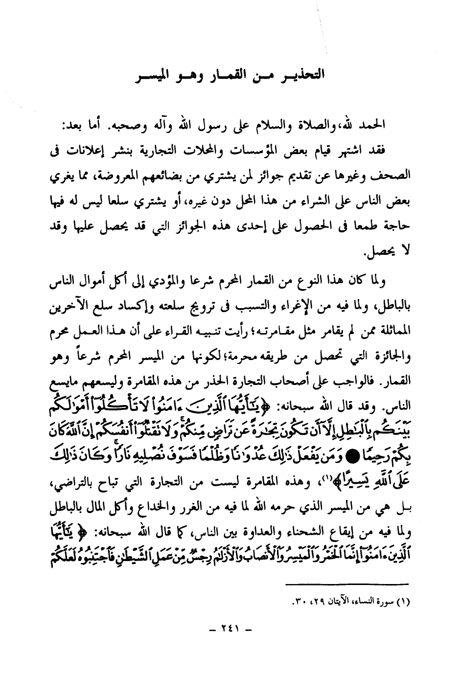 ولما كان هذا النوع من القمار المحرم شرعا والمؤدي إلى أكل أموال الناس بالباطل، ولما فيه من الإغراء والتسبب في ترويج سلعته وإكساد سلع الآخرين المماثلة ممن لم يقامر مثل مقامرته- رأيت تنبيه القراء على أن هذا العمل محرم والجائزة التي تحصل من طريقة محرمة لكونها من الميسر المحرم شرعا وهو القمار. فالواجب على أصحاب التجارة الحذر من هذه المقامرة وليسعهم ما يسع الناس. وقد قال الله سبحانه: {يَا أَيُّهَا الَّذِينَ آمَنُوا لَا تَأْكُلُوا أَمْوَالَكُمْ بَيْنَكُمْ بِالْبَاطِلِ إِلَّا أَنْ تَكُونَ تِجَارَةً عَنْ تَرَاضٍ مِنْكُمْ وَلَا تَقْتُلُوا أَنْفُسَكُمْ إِنَّ اللَّهَ كَانَ بِكُمْ رَحِيمًا} (¬1) {وَمَنْ يَفْعَلْ ذَلِكَ عُدْوَانًا وَظُلْمًا فَسَوْفَ نُصْلِيهِ نَارًا وَكَانَ ذَلِكَ عَلَى اللَّهِ يَسِيرًا} (¬2)