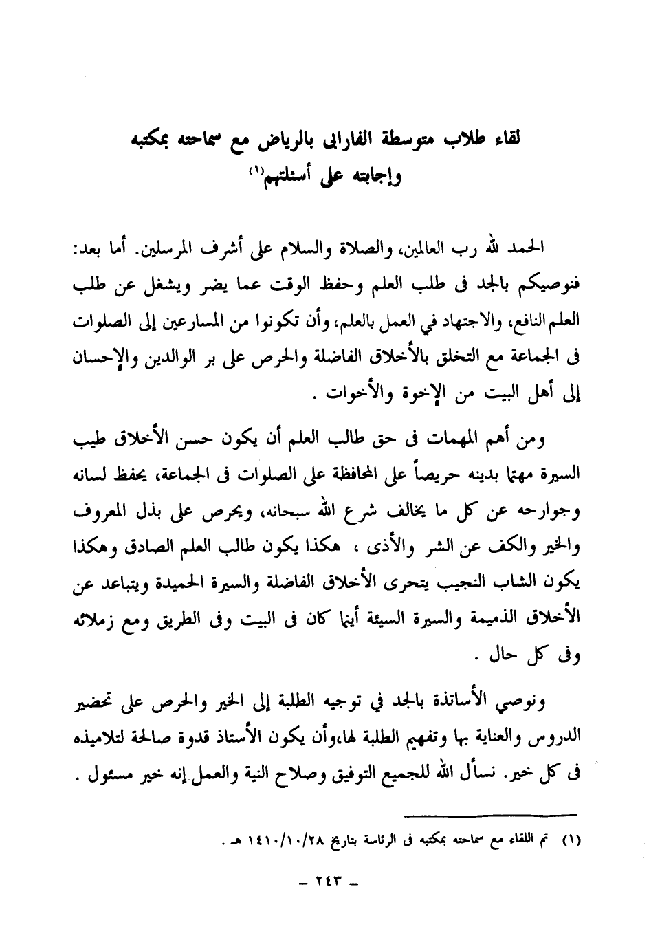 الحمد لله رب العالمين والصلاة والسلام على أشرف المرسلين. أما بعد: فنوصيكم بالجد في طلب العلم وحفظ الوقت عما يضر ويشغل عن طلب العلم النافع والاجتهاد في العمل بالعلم وأن تكونوا من المسارعين إلى الصلوات في الجماعة مع التخلق بالأخلاق الفاضلة والحرص على بر الوالدين والإحسان إلى أهل البيت من الإخوة والأخوات.