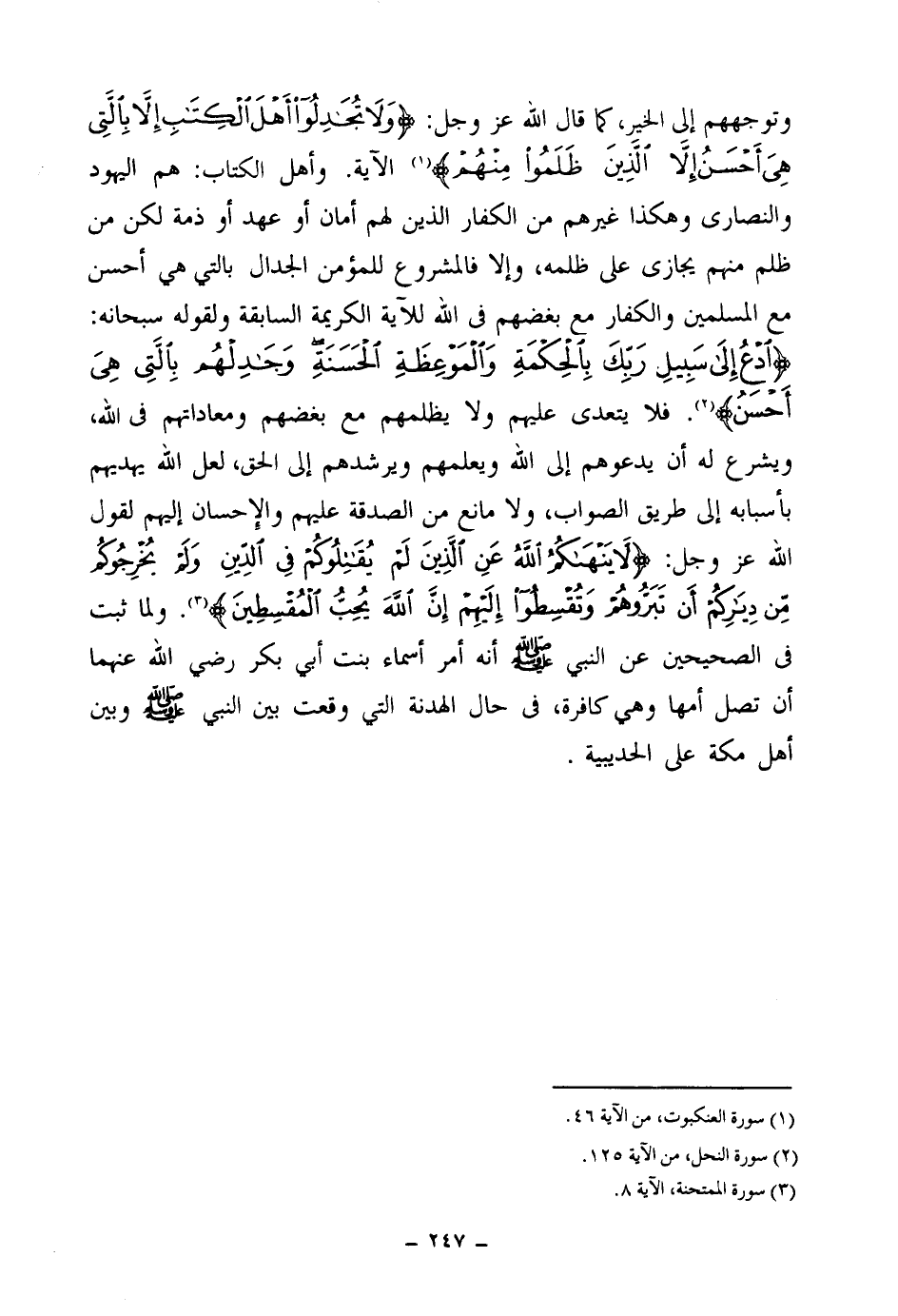 وتوجههم إلى الخير كما قال الله عز وجل: {وَلَا تُجَادِلُوا أَهْلَ الْكِتَابِ إِلَّا بِالَّتِي هِيَ أَحْسَنُ إِلَّا الَّذِينَ ظَلَمُوا مِنْهُمْ} (¬1) الآية. وأهل الكتاب هم اليهود والنصارى وهكذا غيرهم من الكفار الذين لهم أمان أو عهد أو ذمة، لكن من ظلم منهم يجازى على ظلمه، وإلا فالمشروع للمؤمن الجدال بالتي هي أحسن مع المسلمين والكفار مع بغضهم في الله للآية الكريمة السابقة ولقوله سبحانه: {ادْعُ إِلَى سَبِيلِ رَبِّكَ بِالْحِكْمَةِ وَالْمَوْعِظَةِ الْحَسَنَةِ وَجَادِلْهُمْ بِالَّتِي هِيَ أَحْسَنُ} (¬2) فلا يتعدى عليهم ولا يظلمهم مع بغضهم ومعاداتهم في الله ويشرع له أن يدعوهم إلى الله ويعلمهم ويرشدهم إلى الحق لعل الله يهديهم بأسبابه إلى طريق الصواب، ولا مانع من الصدقة عليهم والإحسان إليهم لقول الله عز وجل: {لَا يَنْهَاكُمُ اللَّهُ عَنِ الَّذِينَ لَمْ يُقَاتِلُوكُمْ فِي الدِّينِ وَلَمْ يُخْرِجُوكُمْ مِنْ دِيَارِكُمْ أَنْ تَبَرُّوهُمْ وَتُقْسِطُوا إِلَيْهِمْ إِنَّ اللَّهَ يُحِبُّ الْمُقْسِطِينَ} (¬3) ولما ثبت في الصحيحين عن النبي صلى الله عليه وسلم أنه أمر أسماء بنت أبي بكر رضي الله عنهما أن تصل أمها، وهي كافرة، في حال الهدنة التي وقعت بين النبي صلى الله عليه وسلم وبين أهل مكة على الحديبية
