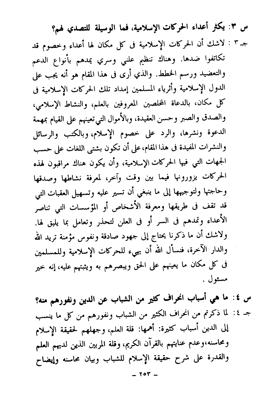 جـ 3: لا شك أن الحركات الإسلامية في كل مكان لها أعداء وخصوم قد تكاتفوا ضدها. وهناك تنظيم علني وسري يمدهم بأنواع الدعم والتعضيد ورسم الخطط. والذي أرى في هذا المقام هو أنه يجب على الدول الإسلامية وأثرياء المسلمين إمداد تلك الحركات الإسلامية في كل مكان بالدعاة المخلصين المعروفين بالعلم والنشاط الإسلامي والصدق والصبر وحسن العقيدة بالأموال التي تعينهم على القيام بمهمة الدعوة ونشرها والرد على خصوم الإسلام، وبالكتب والرسائل والنشرات المفيدة في هذا المقام على أن تكون بشتى اللغات على حسب الجهات التي فيها الحركات الإسلامية وأن يكون هناك مراقبون لهذه الحركات يزورونها فيما بين وقت وآخر لمعرفة نشاطها وصدقها وحاجتها ولتوجيهها إلى ما ينبغي أن تسير عليه وتسهيل العقبات التي قد تقف في طريقها ومعرفة الأشخاص أو المؤسسات التي تناصر الأعداء وتمدهم في السر أو في العلن لتحذر وتعامل بما يليق لها. ولا شك أن ما ذكرنا يحتاج إلى جهود صادقة ونفوس مؤمنة تريد الله والدار الآخرة فنسأل الله أن يهيئ للحركات الإسلامية وللمسلمين في كل مكان ما يعينهم على الحق ويبصرهم به ويثبتهم عليه إنه خير مسئول.
