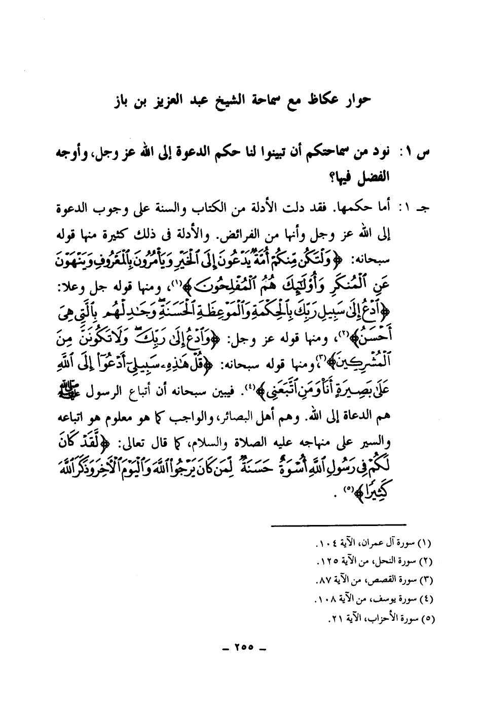 جـ 1: أما حكمها. فقد دلت الأدلة من الكتاب والسنة على وجوب الدعوة إلى الله عز وجل وأنها من الفرائض. والأدلة في ذلك كثيرة منها قوله سبحانه: {وَلْتَكُنْ مِنْكُمْ أُمَّةٌ يَدْعُونَ إِلَى الْخَيْرِ وَيَأْمُرُونَ بِالْمَعْرُوفِ وَيَنْهَوْنَ عَنِ الْمُنْكَرِ وَأُولَئِكَ هُمُ الْمُفْلِحُونَ} (¬1) ومنها قوله جل وعلا: {ادْعُ إِلَى سَبِيلِ رَبِّكَ بِالْحِكْمَةِ وَالْمَوْعِظَةِ الْحَسَنَةِ وَجَادِلْهُمْ بِالَّتِي هِيَ أَحْسَنُ} (¬2) ومنها قوله عز وجل: {وَادْعُ إِلَى رَبِّكَ وَلَا تَكُونَنَّ مِنَ الْمُشْرِكِينَ} (¬3) ومنها قوله سبحانه: {قُلْ هَذِهِ سَبِيلِي أَدْعُو إِلَى اللَّهِ عَلَى بَصِيرَةٍ أَنَا وَمَنِ اتَّبَعَنِي} (¬4) فيبين سبحانه أن أتباع الرسول صلى الله عليه وسلم هم الدعاة إلى الله. وهم أهل البصائر والواجب كما هو معلوم هو اتباعه والسير على منهاجه عليه الصلاة والسلام كما قال تعالى: {لَقَدْ كَانَ لَكُمْ فِي رَسُولِ اللَّهِ أُسْوَةٌ حَسَنَةٌ لِمَنْ كَانَ يَرْجُو اللَّهَ وَالْيَوْمَ الْآخِرَ وَذَكَرَ اللَّهَ كَثِيرًا} (¬5)