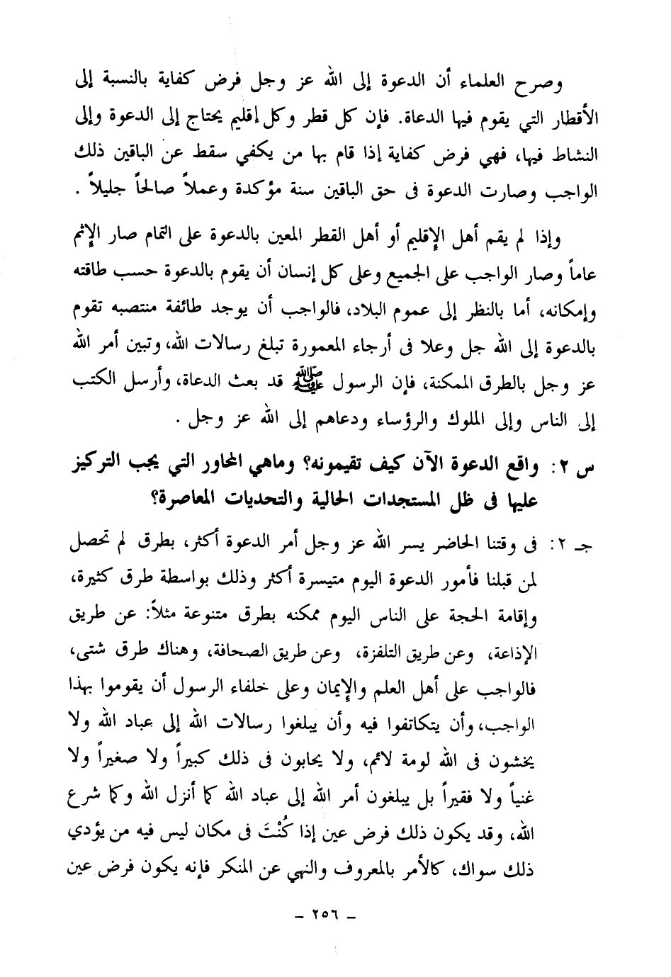 جـ 2: في وقتنا الحاضر يسر الله عز وجل أمر الدعوة أكثر، بطرق لم تحصل لمن قبلنا فأمور الدعوة اليوم متيسرة أكثر وذلك بواسطة طرق كثيرة، وإقامة الحجة على الناس اليوم ممكنه بطرق متنوعة مثلا عن طريق الإذاعة وعن طريق التلفزة وعن طريق الصحافة وهناك طرق شتى، فالواجب على أهل العلم والإيمان وعلى خلفاء الرسول أن يقوموا بهذا الواجب وأن يتكاتفوا فيه وأن يبلغوا رسالات الله إلى عباد الله ولا يخشون في الله لومة لائم، ولا يحابون في ذلك كبيرا ولا صغيرا ولا غنيا ولا فقيرا بل يبلغون أمر الله إلى عباد الله كما أنزل الله وكما شرع الله، وقد يكون ذلك فرض عين إذا كنت في مكان ليس فيه من يؤدي ذلك سواك، كالأمر بالمعروف والنهي عن المنكر فإنه يكون فرض عين