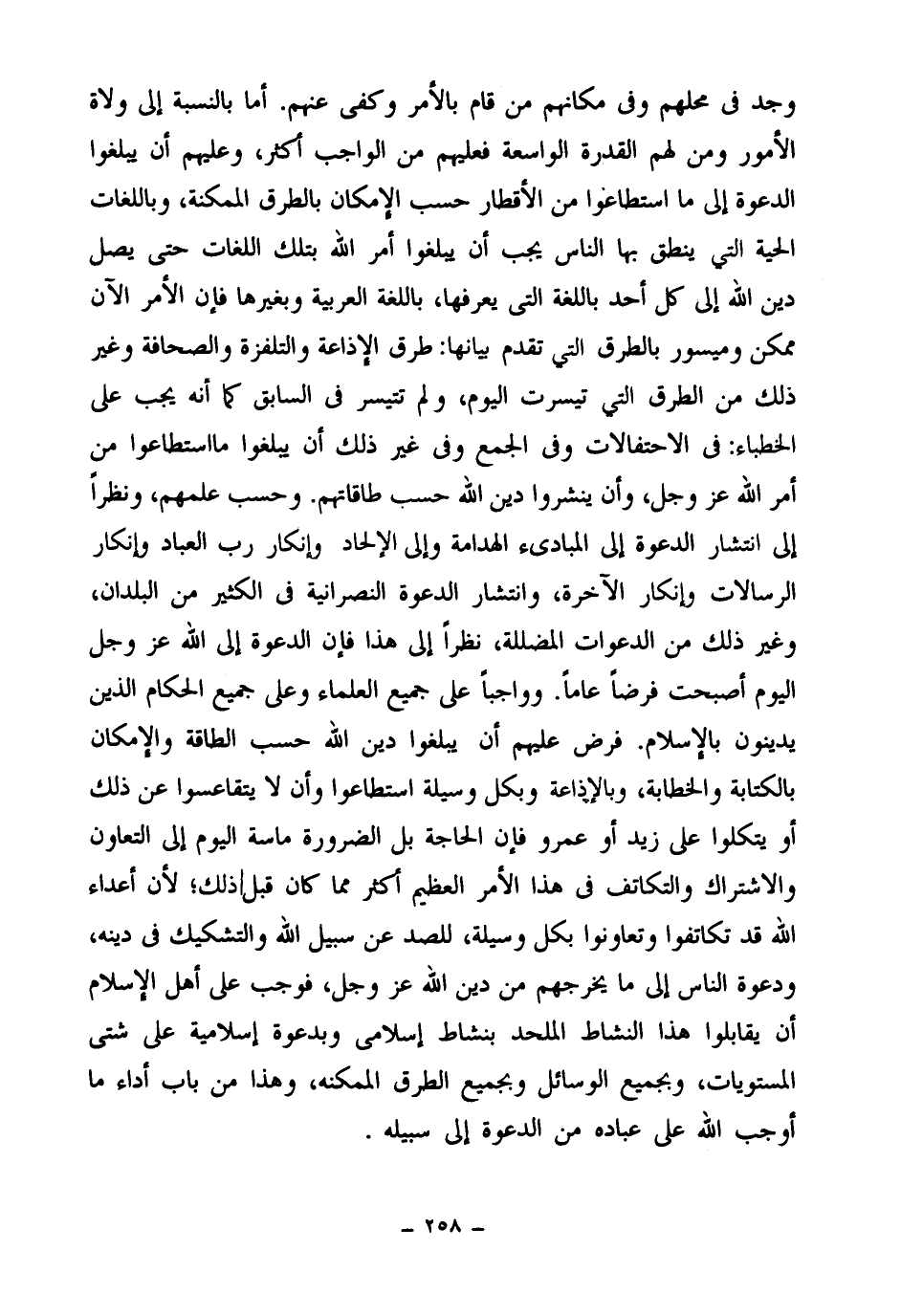 وجد في محلهم وفي مكانهم من قام بالأمر وكفى عنهم. أما بالنسبة إلى ولاة الأمور ومن لهم القدرة الواسعة فعليهم من الواجب أكثر، وعليهم أن يبلغوا الدعوة إلى ما استطاعوا من الأقطار حسب الإمكان بالطرق الممكنة، وباللغات الحية التي ينطق بها الناس يجب أن يبلغوا أمر الله بتلك اللغات حتى يصل دين الله إلى كل أحد باللغة التي يعرفها، باللغة العربية وبغيرها، فإن الأمر الآن ممكن وميسور بالطرق التي تقدم بيانها، طرق الإذاعة والتلفزة والصحافة وغير ذلك من الطرق التي تيسرت اليوم، ولم تتيسر في السابق كما أنه يجب على الخطباء في الاحتفالات وفي الجمع وفي غير ذلك أن يبلغوا ما استطاعوا من أمر الله عز وجل، وأن ينشروا دين الله حسب طاقاتهم. وحسب علمهم، ونظرا إلى انتشار الدعوة إلى المبادئ الهدامة وإلى الإلحاد وإنكار رب العباد وإنكار الرسالات وإنكار الآخرة، وانتشار الدعوة النصرانية في الكثير من البلدان، وغير ذلك من الدعوات المضللة، نظرا إلى هذا فإن الدعوة إلى الله عز وجل اليوم أصبحت فرضا عاما. وواجبا على جميع العلماء وعلى جميع الحكام الذين يدينون بالإسلام. فرض عليهم أن يبلغوا دين الله حسب الطاقة والإمكان بالكتابة والخطابة، وبالإذاعة وبكل وسيلة استطاعوا وأن لا يتقاعسوا عن ذلك أو يتكلوا على زيد أو عمرو فإن الحاجة بل الضرورة ماسة اليوم إلى التعاون والاشتراك والتكاتف في هذا الأمر العظيم أكثر مما كان قبل ذلك؛ لأن أعداء الله قد تكاتفوا وتعاونوا بكل وسيلة، للصد عن سبيل الله والتشكيك في دينه، ودعوة الناس إلى ما يخرجهم من دين الله عز وجل، فوجب على أهل الإسلام أن يقابلوا هذا النشاط الملحد بنشاط إسلامي وبدعوة إسلامية على شتى المستويات، وبجميع الوسائل وبجميع الطرق الممكنة، وهذا من باب أداء ما أوجب الله على عباده من الدعوة إلى سبيله.