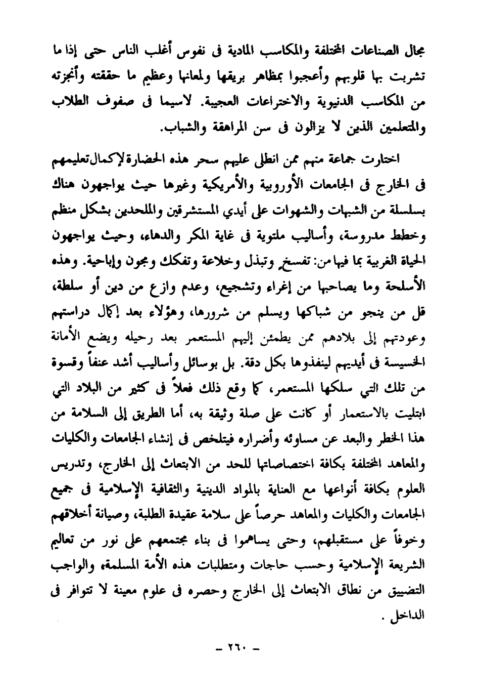 اختارت جماعة منهم ممن انطلى عليهم سحر هذه الحضارة لإكمال تعليمهم في الخارج في الجامعات الأوروبية والأمريكية وغيرها حيث يواجهون هناك بسلسلة من الشبهات والشهوات على أيدي المستشرقين والملحدين بشكل منظم وخطط مدروسة، وأساليب ملتوية في غاية المكر والدهاء، وحيث يواجهون الحياة الغربية بما فيها من تفسخ وتبذل وخلاعة وتفكك ومجون وإباحية. وهذه الأسلحة وما يصاحبها من إغراء وتشجيع، وعدم وازع من دين أو سلطة، قل من ينجو من شباكها ويسلم من شرورها وهؤلاء بعد إكمال دراستهم وعودتهم إلى بلادهم ممن يطمئن إليهم المستعمر بعد رحيله ويضع الأمانة الخسيسة في أيديهم لينفذوها بكل دقة. بل بوسائل وأساليب أشد عنفا وقسوة من تلك التي سلكها المستعمر، كما وقع ذلك فعلا في كثير من البلاد التي ابتليت بالاستعمار أو كانت على صلة وثيقة به. أما الطريق إلى السلامة من هذا الخطر والبعد عن مساوئه وأضراره فيتلخص في إنشاء الجامعات والكليات والمعاهد المختلفة بكافة اختصاصاتها للحد من الابتعاث إلى الخارج، وتدريس العلوم بكافة أنواعها مع العناية بالمواد الدينية والثقافية الإسلامية في جميع الجامعات والكليات والمعاهد حرصا على سلامة عقيدة الطلبة، وصيانة أخلاقهم وخوفا على مستقبلهم، وحتى يساهموا في بناء مجتمعهم على نور من تعاليم الشريعة الإسلامية وحسب حاجات ومتطلبات هذه الأمة المسلمة، والواجب التضييق من نطاق الابتعاث إلى الخارج وحصره في علوم معينة لا تتوافر في الداخل.