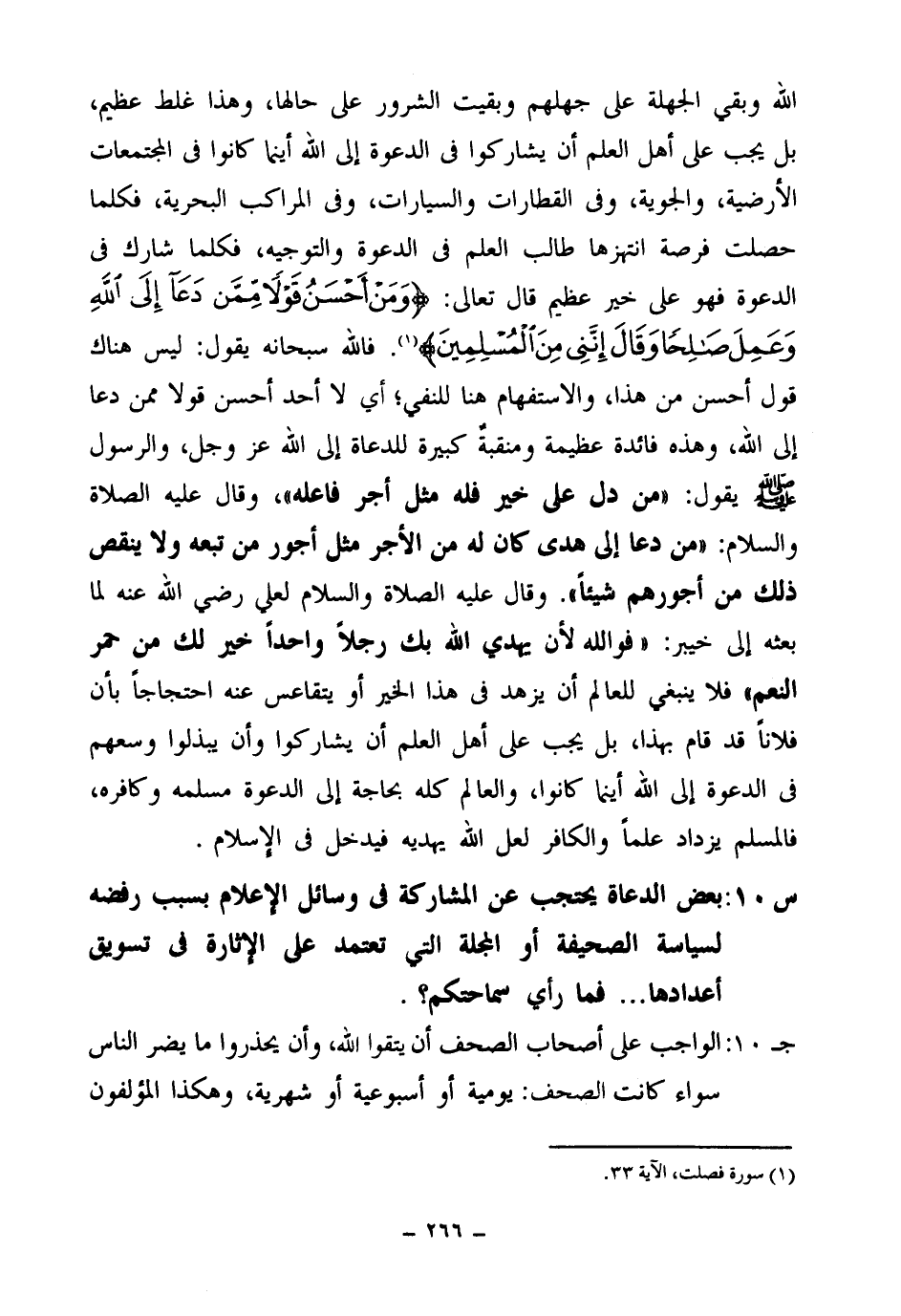 الله وبقي الجهلة على جهلهم وبقيت الشرور على حالها، وهذا غلط عظيم، بل يجب على أهل العلم أن يشاركوا في الدعوة إلى الله أينما كانوا في المجتمعات الأرضية، والجوية، وفي القطارات والسيارات، وفي المراكب البحرية، فكلما حصلت فرصة انتهزها طالب العلم في الدعوة والتوجيه، فكلما شارك في الدعوة فهو على خير عظيم قال تعالى: {وَمَنْ أَحْسَنُ قَوْلًا مِمَّنْ دَعَا إِلَى اللَّهِ وَعَمِلَ صَالِحًا وَقَالَ إِنَّنِي مِنَ الْمُسْلِمِينَ} (¬1)