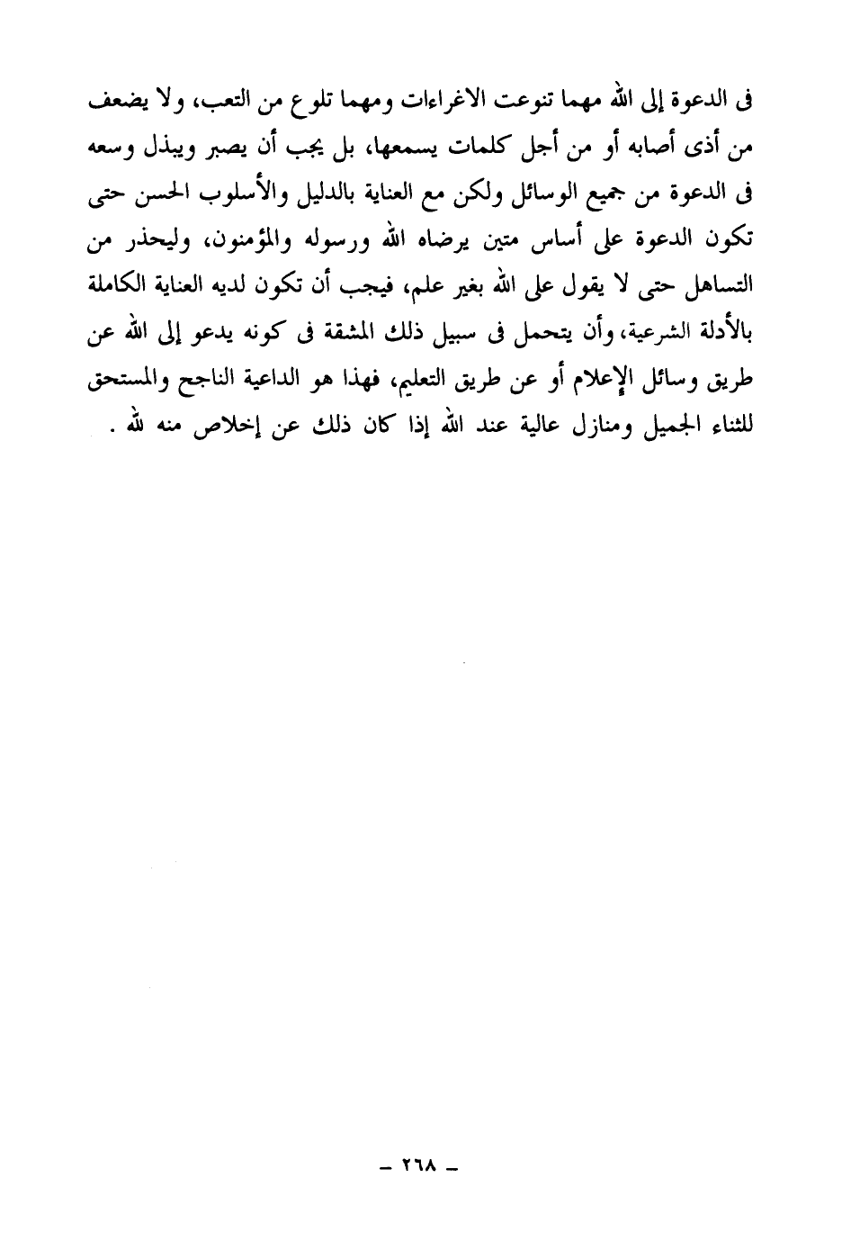 في الدعوة إلى الله مهما تنوعت الإغراءات ومهما تلوع من التعب، ولا يضعف من أذى أصابه أو من أجل كلمات يسمعها، بل يجب أن يصبر ويبذل وسعه في الدعوة من جميع الوسائل ولكن مع العناية بالدليل والأسلوب الحسن حتى تكون الدعوة على أساس متين يرضاه الله ورسوله والمؤمنون، وليحذر من التساهل حتى لا يقول على الله بغير علم، فيجب أن تكون لديه العناية الكاملة بالأدلة الشرعية وأن يتحمل في سبيل ذلك المشقة في كونه يدعو إلى الله عن طريق وسائل الإعلام أو عن طريق التعليم، فهذا هو الداعية الناجح والمستحق للثناء الجميل ومنازل عالية عند الله إذا كان ذلك عن إخلاص منه لله.