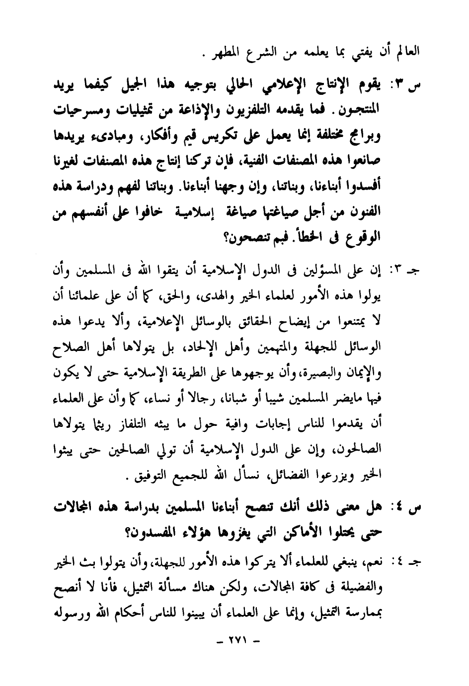 جـ 4: نعم، ينبغي للعلماء ألا يتركوا هذه الأمور للجهلة، وأن يتولوا بث الخير والفضيلة في كافة المجالات، ولكن هناك مسألة التمثيل، فأنا لا أنصح بممارسة التمثيل، وإنما على العلماء أن يبينوا للناس أحكام الله ورسوله