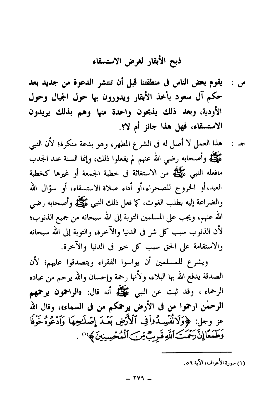 س: يقوم بعض الناس في منطقتنا قبل أن تنتشر الدعوة من جديد بعد حكم آل سعود بأخذ الأبقار، ويدورون بها حول الجبال وحول الأودية، وبعد ذلك يذبحون واحدة منها وهم بذلك يريدون الاستسقاء، فهل هذا جائز أم لا؟ .