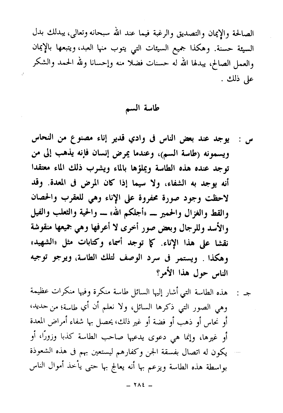 جـ: هذه الطاسة التي أشار إليها السائل طاسة منكرة، وفيها منكرات عظيمة، وهي الصور التي ذكرها السائل، ولا نعلم أن أي طاسة من حديد أو نحاس أو ذهب أو فضة أو غير ذلك يحصل بها شفاء أمراض المعدة أو غيرها، وإنما هي دعوى يدعيها صاحب الطاسة كذبا وزورا، أو يكون له اتصال بفسقة الجن وكفارهم ليستعين بهم في هذه الشعوذة بواسطة هذه الطاسة، ويزعم بها أنه يعالج بها حتى يأخذ أموال الناس