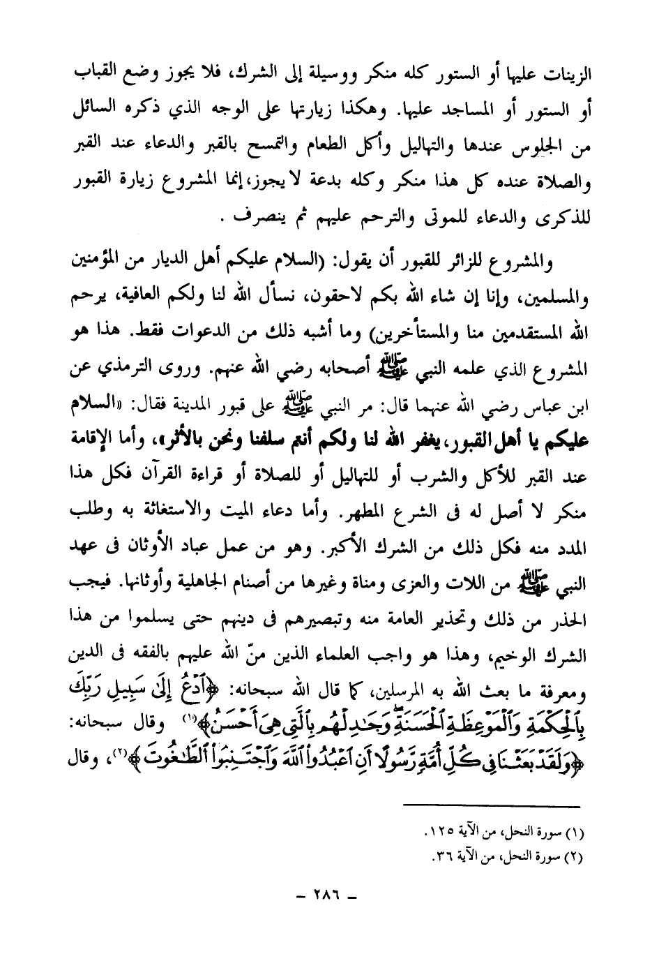 فيجب الحذر من ذلك وتحذير العامة منه وتبصيرهم في دينهم حتى يسلموا من هذا الشرك الوخيم، وهذا هو واجب العلماء الذين من الله عليهم بالفقه في الدين ومعرفة ما بعث الله به المرسلين، كما قال الله سبحانه: {ادْعُ إِلَى سَبِيلِ رَبِّكَ بِالْحِكْمَةِ وَالْمَوْعِظَةِ الْحَسَنَةِ وَجَادِلْهُمْ بِالَّتِي هِيَ أَحْسَنُ} (¬2) وقال سبحانه: {وَلَقَدْ بَعَثْنَا فِي كُلِّ أُمَّةٍ رَسُولًا أَنِ اُعْبُدُوا اللَّهَ وَاجْتَنِبُوا الطَّاغُوتَ} (¬3) وقال