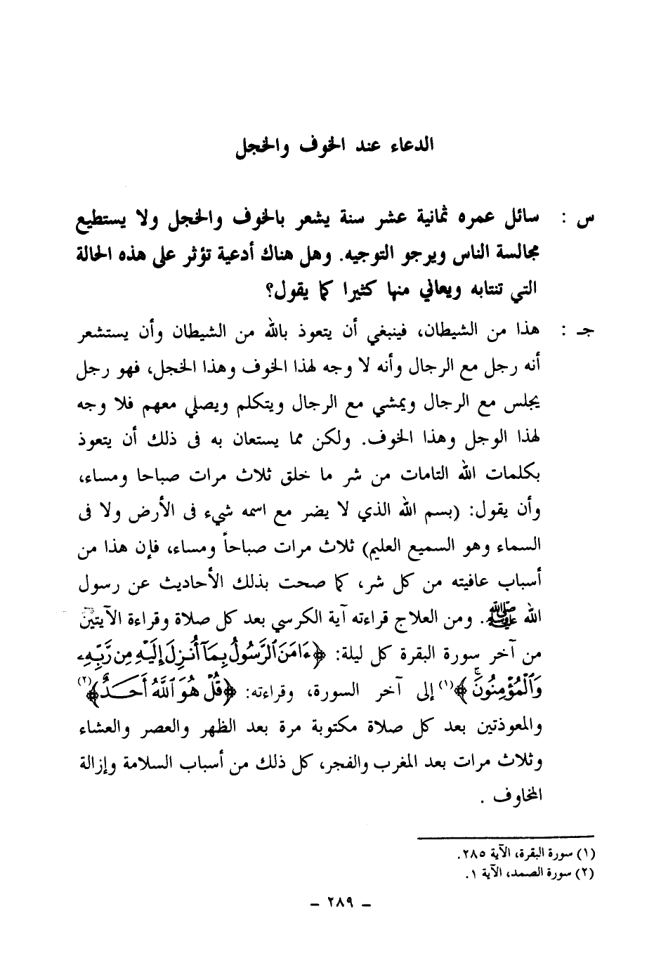 ومن العلاج قراءته آية الكرسي بعد كل صلاة وقراءة الآيتين من آخر سورة البقرة كل ليلة: {آمَنَ الرَّسُولُ بِمَا أُنْزِلَ إِلَيْهِ مِنْ رَبِّهِ وَالْمُؤْمِنُونَ} (¬1) إلى آخر السورة وقراءته {قُلْ هُوَ اللَّهُ أَحَدٌ} (¬2) والمعوذتين بعد كل صلاة مكتوبة؛ مرة بعد الظهر والعصر والعشاء، وثلاث مرات بعد المغرب والفجر، كل ذلك من أسباب السلامة وإزالة المخاوف.