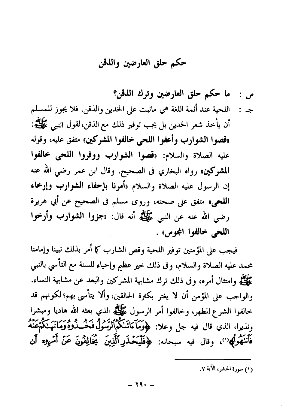 فيجب على المؤمنين توفير اللحية وقص الشارب كما أمر بذلك نبينا وإمامنا محمد عليه الصلاة والسلام، وفي ذلك خير عظيم وإحياء للسنة مع التأسي بالنبي صلى الله عليه وسلم وامتثال أمره، وفي ذلك ترك مشابهة المشركين والبعد عن مشابهة النساء، والواجب على المؤمن أن لا يغتر بكثرة الحالقين، وألا يتأسى بهم لكونهم قد خالفوا الشرع المطهر وخالفوا أمر الرسول صلى الله عليه وسلم الذي بعثه الله هاديا ومبشرا ونذيرا الذي قال فيه جل وعلا: {وَمَا آتَاكُمُ الرَّسُولُ فَخُذُوهُ وَمَا نَهَاكُمْ عَنْهُ فَانْتَهُوا} (¬5) وقال فيه سبحانه: