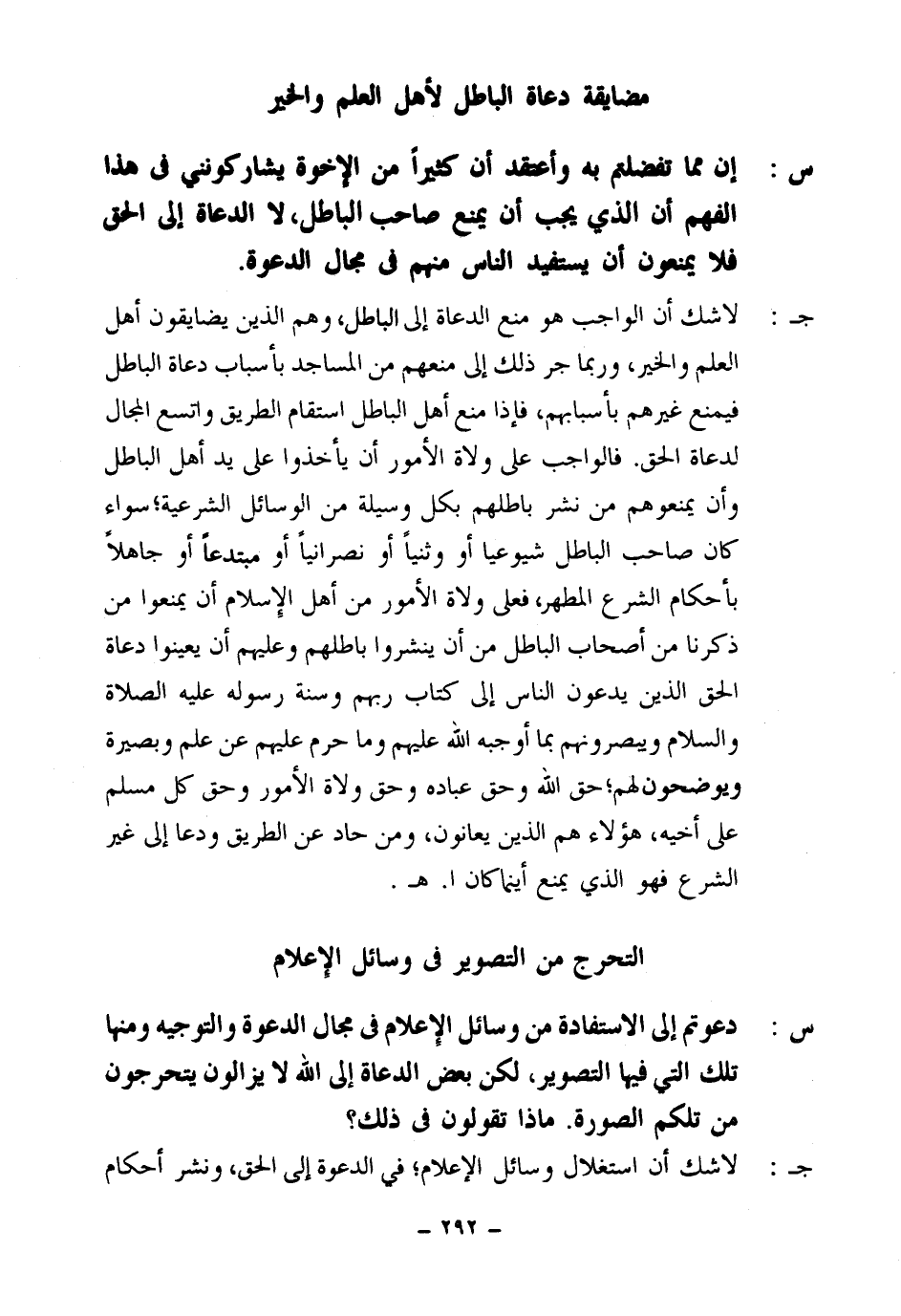 س: دعوتم إلى الاستفادة من وسائل الإعلام في مجال الدعوة والتوجيه، ومنها تلك التي فيها التصوير، لكن بعض الدعاة إلى الله لا يزالون يتحرجون من تلكم الصورة. ماذا تقولون في ذلك؟