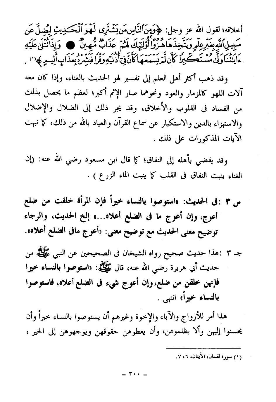 وقد يفضي بأهله إلى النفاق؛ كما قال ابن مسعود رضي الله عنه: إن الغناء ينبت النفاق في القلب كما ينبت الماء الزرع. س 3: في الحديث: «استوصوا بالنساء خيرا فإن المرأة خلقت من ضلع أعوج، وإن أعوج ما في الضلع أعلاه (¬3) » . . . إلخ الحديث، والرجاء توضيح معنى الحديث مع توضيح معنى: أعوج ما في الضلع أعلاه.