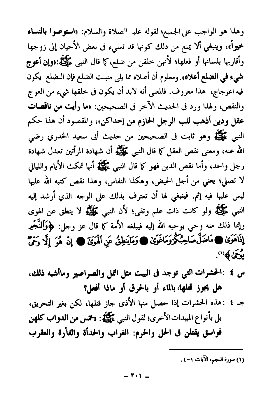 فينبغي لها أن تعترف بذلك على الوجه الذي أرشد إليه النبي صلى الله عليه وسلم ولو كانت ذات علم وتقى؛ لأن النبي صلى الله عليه وسلم لا ينطق عن الهوى، وإنما ذلك منه وحي يوحيه الله إليه فيبلغه الأمة كما قال عز وجل: {وَالنَّجْمِ إِذَا هَوَى} (¬3) {مَا ضَلَّ صَاحِبُكُمْ وَمَا غَوَى} (¬4) {وَمَا يَنْطِقُ عَنِ الْهَوَى} (¬5) {إِنْ هُوَ إِلَّا وَحْيٌ يُوحَى} (¬6) .