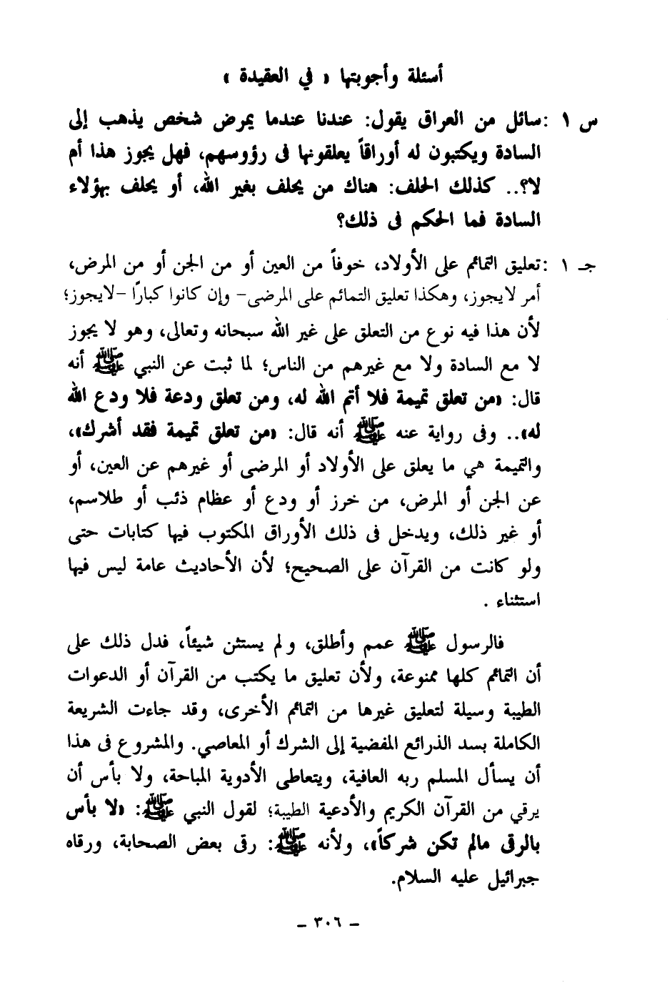 س1: سائل من العراق يقول: عندنا عندما يمرض شخص يذهب إلى السادة، ويكتبون له أوراقا يعلقونها في رءوسهم، فهل يجوز هذا أم لا؟ كذلك الحلف: هناك من يحلف بغير الله، أو يحلف بهؤلاء السادة فما الحكم في ذلك؟ .