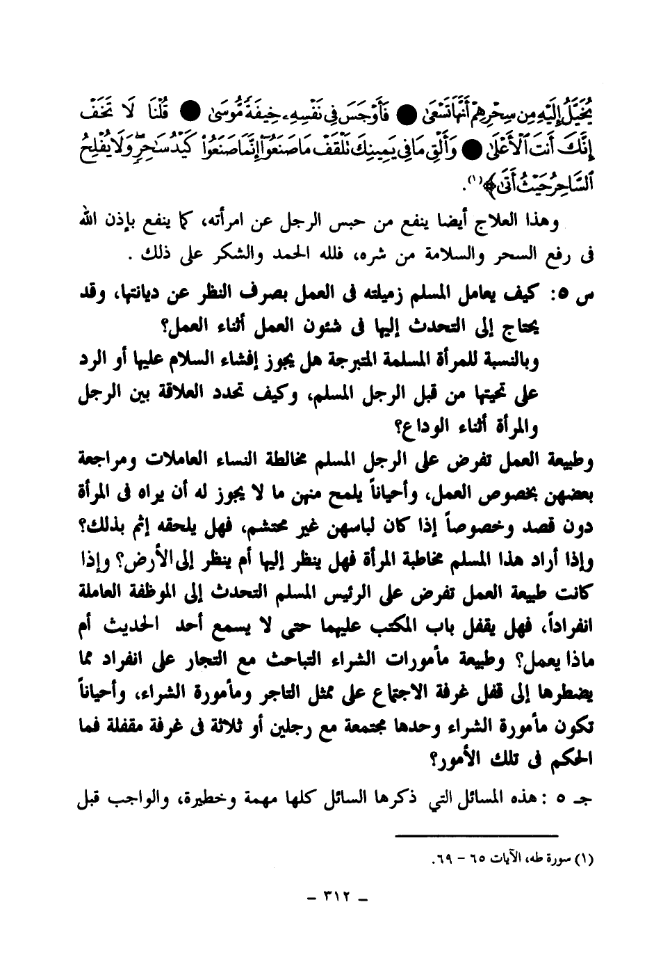 س5: كيف يعامل المسلم زميلته في العمل بصرف النظر عن ديانتها، وقد يجتاج إلى التحدث إليها في شئون العمل أثناء العمل؟ وبالنسبة للمرأة المسلمة المتبرجة هل يجوز إفشاء السلام عليها أو الرد على تحيتها من قبل الرجل المسلم، وكيف تحدد العلاقة بين الرجل والمرأة أثناء الوداع؟