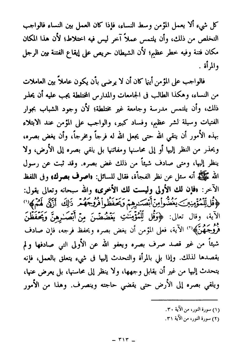وقد ثبت عن رسول الله صلى الله عليه وسلم أنه سئل عن نظر الفجأة، فقال للسائل: «اصرف بصرك (¬1) » وفي اللفظ الآخر: «فإن لك الأولى وليست لك الأخرى (¬2) » ، والله سبحانه وتعالى يقول: {قُلْ لِلْمُؤْمِنِينَ يَغُضُّوا مِنْ أَبْصَارِهِمْ وَيَحْفَظُوا فُرُوجَهُمْ ذَلِكَ أَزْكَى لَهُمْ} (¬3) الآية، وقال تعالى: {وَقُلْ لِلْمُؤْمِنَاتِ يَغْضُضْنَ مِنْ أَبْصَارِهِنَّ وَيَحْفَظْنَ فُرُوجَهُنَّ} (¬4) الآية، فعلى المؤمن أن يغض بصره ويحفظ فرجه، فإن صادف شيئا من غير قصد صرف بصره، ويعفو الله عن الأولى التي صادفها ولم يقصدها لذلك.