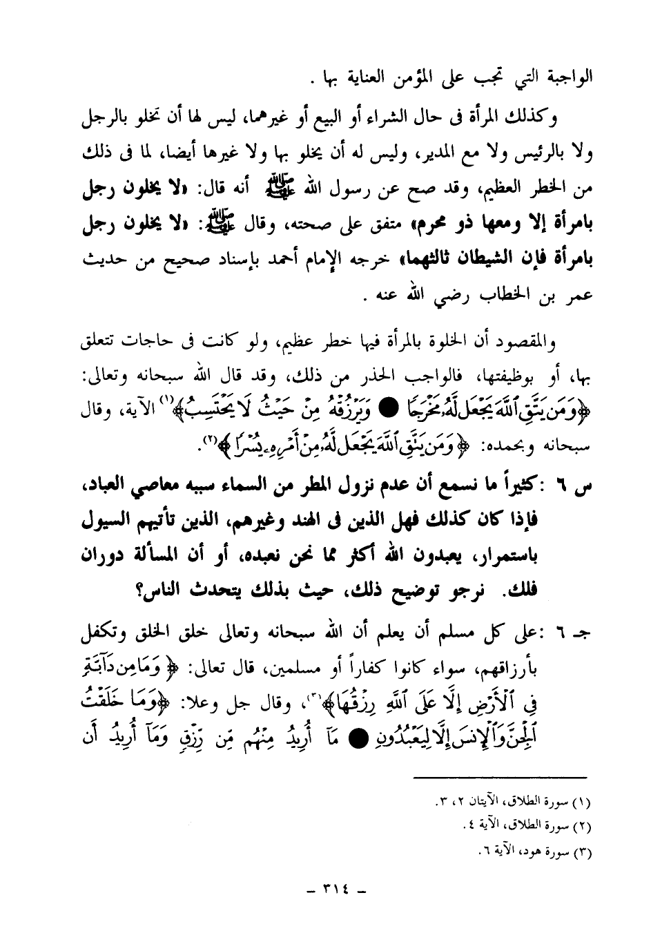 والمقصود أن الخلوة بالمرأة فيها خطر عظيم، ولو كانت في حاجات تتعلق بها، أو بوظيفتها. فالواجب الحذر من ذلك، وقد قال الله سبحانه وتعالى: {وَمَنْ يَتَّقِ اللَّهَ يَجْعَلْ لَهُ مَخْرَجًا} (¬3) {وَيَرْزُقْهُ مِنْ حَيْثُ لَا يَحْتَسِبُ} (¬4) الآية، وقال سبحانه وبحمده: {وَمَنْ يَتَّقِ اللَّهَ يَجْعَلْ لَهُ مِنْ أَمْرِهِ يُسْرًا} (¬5) س6: كثيرا ما نسمع أن عدم نزول المطر من السماء سببه معاصي العباد، فإذا كان كذلك فهل الذين في الهند وغيرهم، الذين تأتيهم السيول باستمرار، يعبدون الله أكثر مما نحن نعبده، أو أن المسألة دوران فلك ... نرجو توضيح ذلك، حيث بذلك يتحدث الناس؟ .