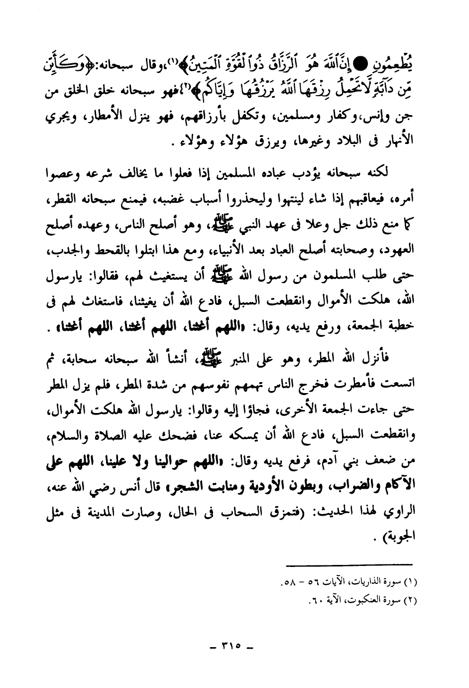 لكنه سبحانه يؤدب عباده المسلمين إذا فعلوا ما يخالف شرعه وعصوا أمره، فيعاقبهم إذا شاء لينتهوا وليحذروا أسباب غضبه، فيمنع سبحانه القطر، كما منع ذلك جل وعلا في عهد النبي صلى الله عليه وسلم، وهو أصلح الناس، وعهده أصلح العهود، وصحابته أصلح العباد بعد الأنبياء، ومع هذا ابتلوا بالقحط والجدب، حتى طلب المسلمون من رسول الله صلى الله عليه وسلم أن يستغيث لهم، فقالوا: يا رسول الله، هلكت الأموال وانقطعت السبل، فادع الله أن يغيثنا، فاستغاث لهم في خطبة الجمعة، ورفع يديه، وقال: «اللهم أغثنا اللهم أغثنا اللهم أغثنا (¬2) » .