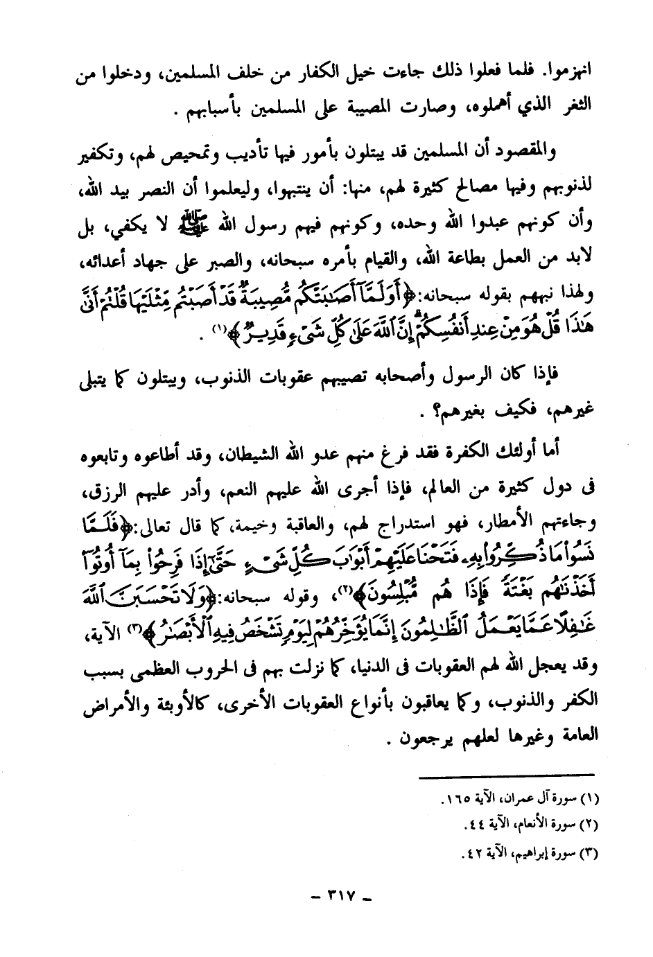 والمقصود أن المسلمين قد يبتلون بأمور فيها تأديب وتمحيص لهم، وتكفير لذنوبهم، وفيها مصالح كثيرة لهم، منها: أن ينتبهوا، وليعلموا أن النصر بيد الله، وأن كونهم عبدوا الله وحده، وكونهم فيهم رسول الله صلى الله عليه وسلم لا يكفي، بل لا بد من العمل بطاعة الله، والقيام بأمره سبحانه، والصبر على جهاد أعدائه، ولهذا نبههم بقوله سبحانه: {أَوَلَمَّا أَصَابَتْكُمْ مُصِيبَةٌ قَدْ أَصَبْتُمْ مِثْلَيْهَا قُلْتُمْ أَنَّى هَذَا قُلْ هُوَ مِنْ عِنْدِ أَنْفُسِكُمْ إِنَّ اللَّهَ عَلَى كُلِّ شَيْءٍ قَدِيرٌ} (¬1) فإذا كان الرسول وأصحابه تصيبهم عقوبات الذنوب، وبيتلون كما يبتلى غيرهم، فكيف بغيرهم؟
