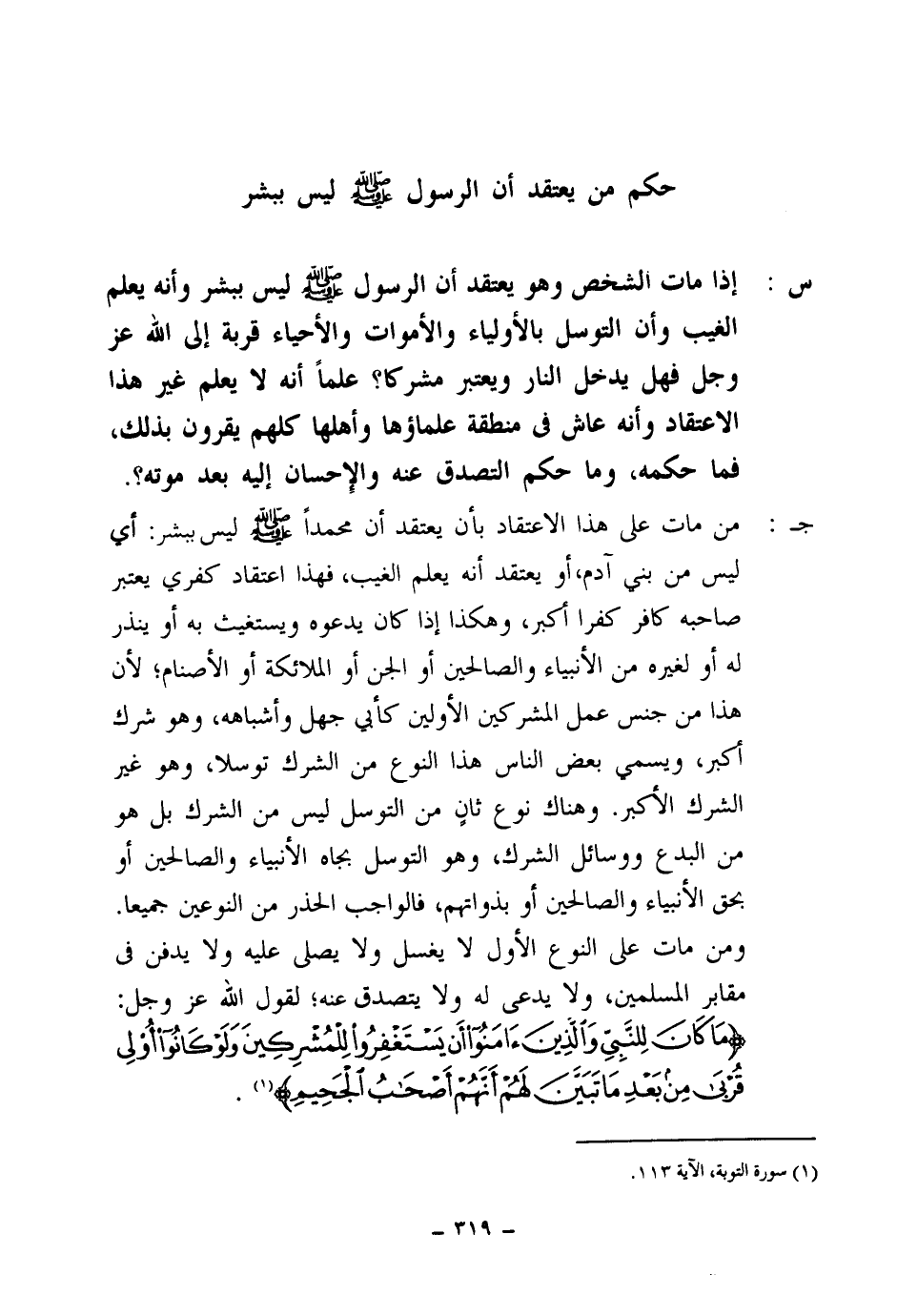 جـ: من مات على هذا الاعتقاد بأن يعتقد أن محمدا ليس ببشر، أي ليس من بني آدم، أو يعتقد أنه يعلم الغيب فهذا اعتقاد كفري يعتبر صاحبه كافر كفرا أكبر، وهكذا إذا كان يدعوه ويستغيث به، أو ينذر له أو لغيره من الأنبياء والصالحين أو الجن أو الملائكة أو الأصنام؛ لأن هذا من جنس عمل المشركين الأولين كأبي جهل وأشباهه، وهو شرك أكبر، ويسمي بعض الناس هذا النوع من الشرك توسلا، وهو غير الشرك الأكبر.