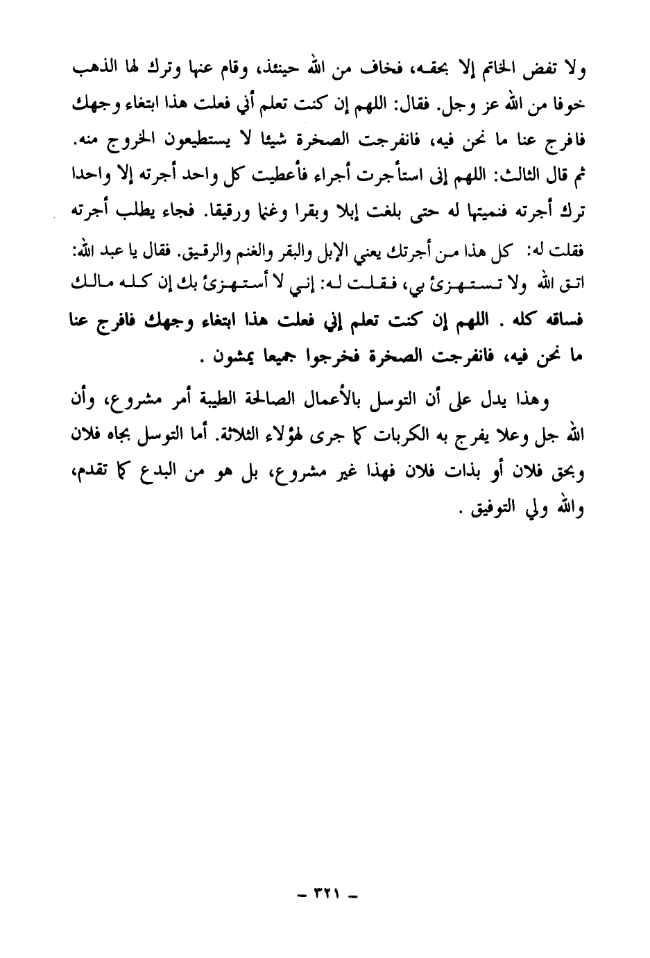 وهذا يدل على أن التوسل بالأعمال الصالحة الطيبة أمر مشروع، وأن الله جل وعلا يفرج به الكربات كما جرى لهؤلاء الثلاثة. أما التوسل بجاه فلان وبحق فلان أو بذات فلان فهذا غير مشروع، بل هو من البدع كما تقدم، والله ولي التوفيق.