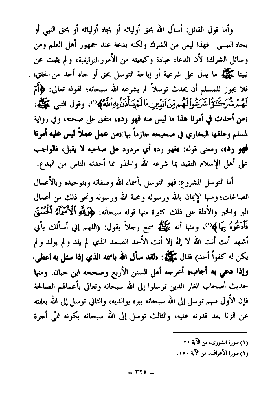 وأما قول القائل: أسأل الله بحق أوليائه أو بجاه أوليائه أو بحق النبي أو بجاه النبي - فهذا ليس من الشرك ولكنه بدعة عند جمهور أهل العلم ومن وسائل الشرك؛ لأن الدعاء عباده وكيفيته من الأمور التوقيفية، ولم يثبت عن نبينا صلى الله عليه وسلم ما يدل على شرعية أو إباحة التوسل بحق أو جاه أحد من الخلق، فلا يجوز لمسلم أن يحدث توسلا لم يشرعه الله سبحانه؛ لقوله تعالى: {أَمْ لَهُمْ شُرَكَاءُ شَرَعُوا لَهُمْ مِنَ الدِّينِ مَا لَمْ يَأْذَنْ بِهِ اللَّهُ} (¬1) وقول النبي صلى الله عليه وسلم: «من أحدث في أمرنا هذا ما ليس منه فهو رد (¬2) » متفق على صحته، وفي رواية لمسلم وعلقها البخاري في صحيحه جازما بها «من عمل عملا ليس عليه أمرنا فهو رد (¬3) » ومعنى قوله: فهو رد، أي مردود على صاحبه لا يقبل، فالواجب، على أهل الإسلام التقيد بما شرعه الله والحذر مما أحدثه الناس من البدع. أما التوسل المشروع فهو التوسل بأسماء الله وصفاته وبتوحيده، وبالأعمال الصالحات، ومنها الإيمان بالله ورسوله ومحبة الله ورسوله ونحو ذلك من أعمال البر والخير، والأدلة على ذلك كثيرة منها قوله سبحانه: {وَلِلَّهِ الْأَسْمَاءُ الْحُسْنَى فَادْعُوهُ بِهَا} (¬4) ومنها «أنه صلى الله عليه وسلم سمع رجلا يقول: اللهم إني أسألك بأني أشهد أنك أنت الله لا إله إلا أنت الأحد الصمد الذي لم يلد ولم يولد ولم يكن له كفوا أحد، فقال صلى الله عليه وسلم: لقد سأل الله باسمه الذي إذا سئل به أعطى، وإذا دعي به أجاب (¬5) » أخرجه أهل السنن الأربع، وصححه ابن حبان. ومنها حديث أصحاب الغار الذين توسلوا إلى الله سبحانه وتعالى بأعمالهم الصالحة، فإن الأول منهم توسل إلى الله سبحانه ببره بوالديه، والثاني توسل إلى الله بعفته عن الزنا بعد قدرته عليه، والثالث توسل إلى الله سبحانه بكونه نمى أجرة
