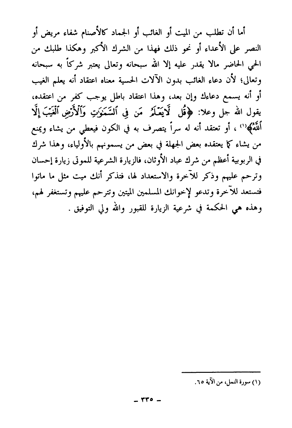 أما أن تطلب من الميت أو الغائب أو الجماد كالأصنام شفاء مريض أو النصر على الأعداء أو نحو ذلك فهذا من الشرك الأكبر، وهكذا طلبك من الحي الحاضر ما لا يقدر عليه إلا الله سبحانه وتعالى، يعتبر شركا به سبحانه وتعالى؛ لأن دعاء الغائب بدون الآلات الحسية معناه اعتقاد أنه يعلم الغيب أو أنه يسمع دعاءك وإن بعد، وهذا اعتقاد باطل يوجب كفر من اعتقده، يقول الله جل وعلا: {قُلْ لَا يَعْلَمُ مَنْ فِي السَّمَاوَاتِ وَالْأَرْضِ الْغَيْبَ إِلَّا اللَّهُ} (¬1) أو تعتفد أنه له سرا يتصرف به في الكون فيعطي من يشاء ويمنع من يشاء كما يعتقده بعض الجهلة في بعض من يسمونهم بالأولياء، وهذا شرك في الربوبية أعظم من شرك عباد الأوثان، فالزيارة الشرعية للموتى زيارة إحسان وترحم عليهم، وذكر للآخرة والاستعداد لها، فتذكر أنك ميت مثل ما ماتوا فتستعد للآخرة وتدعو لإخوانك المسلمين الميتين، وتترحم عليهم وتستغفر لهم، وهذه هي الحكمة في شرعية الزيارة للقبور، والله ولي التوفيق.