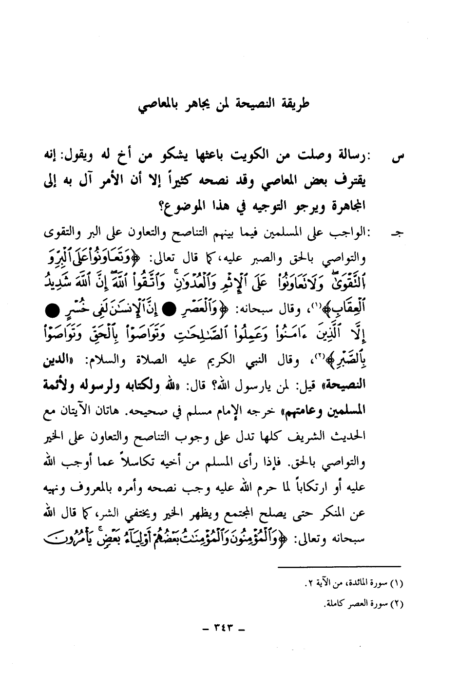 جـ: الواجب على المسلمين فيما بينهم التناصح والتعاون على البر والتقوى، والتواصي بالحق والصبر عليه كما قال تعالى: {وَتَعَاوَنُوا عَلَى الْبِرِّ وَالتَّقْوَى وَلَا تَعَاوَنُوا عَلَى الْإِثْمِ وَالْعُدْوَانِ وَاتَّقُوا اللَّهَ إِنَّ اللَّهَ شَدِيدُ الْعِقَابِ} (¬1) وقال سبحانه: {وَالْعَصْرِ} (¬2) {إِنَّ الْإِنْسَانَ لَفِي خُسْرٍ} (¬3) {إِلَّا الَّذِينَ آمَنُوا وَعَمِلُوا الصَّالِحَاتِ وَتَوَاصَوْا بِالْحَقِّ وَتَوَاصَوْا بِالصَّبْرِ} (¬4) وقال النبي الكريم عليه الصلاة والسلام: «الدين النصيحة، قيل: لمن يا رسول الله؟ قال: لله ولكتابه ولرسوله ولأئمة المسلمين وعامتهم (¬5) » خرجه الإمام مسلم في صحيحه. هاتان الآيتان مع الحديث الشريف كلها تدل على وجوب التناصح والتعاون على الخير والتواصي بالحق. فإذا رأى المسلم من أخيه تكاسلا عما أوجب الله عليه، أو ارتكابا لما حرم الله عليه وجب نصحه وأمره بالمعروف، ونهيه عن المنكر حتى يصلح المجتمع، ويظهر الخير ويختفي الشر كما قال الله سبحانه وتعالى: {وَالْمُؤْمِنُونَ وَالْمُؤْمِنَاتُ بَعْضُهُمْ أَوْلِيَاءُ بَعْضٍ يَأْمُرُونَ بِالْمَعْرُوفِ وَيَنْهَوْنَ عَنِ الْمُنْكَرِ} (¬6)