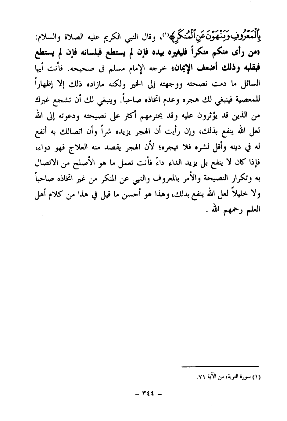 وقال النبي الكريم عليه الصلاة والسلام: «من رأى منكم منكرا فليغيره بيده، فإن لم يستطع فبلسانه، فإن لم يستطع فبقلبه، وذلك أضعف الإيمان (¬1) » خرجه الإمام مسلم في صحيحه. فأنت أيها السائل ما دمت نصحته ووجهته إلى الخير ولكنه ما زاده ذلك إلا إظهارا للمعصية، فينبغي لك هجره وعدم اتخاذه صاحبا. وينبغي لك أن تشجع غيرك من الذين قد يؤثرون عليه وقد يحترمهم أكثر على نصيحته ودعوته إلى الله لعل الله ينفع بذلك، وإن رأيت أن الهجر يزيده شرا وأن اتصالك به أنفع له في دينه وأقل لشره فلا تهجره؛ لأن الهجر يقصد منه العلاج فهو دواء، فإذا كان لا ينفع بل يزيد الداء داءا فأنت تعمل ما هو الأصلح من الاتصال به وتكرار النصيحة، والأمر بالمعروف والنهي عن المنكر من غير اتخاذه صاحبا ولا خليلا لعل الله ينفع بذلك، وهذا هو أحسن ما قيل في هذا من كلام أهل العلم رحمهم الله.