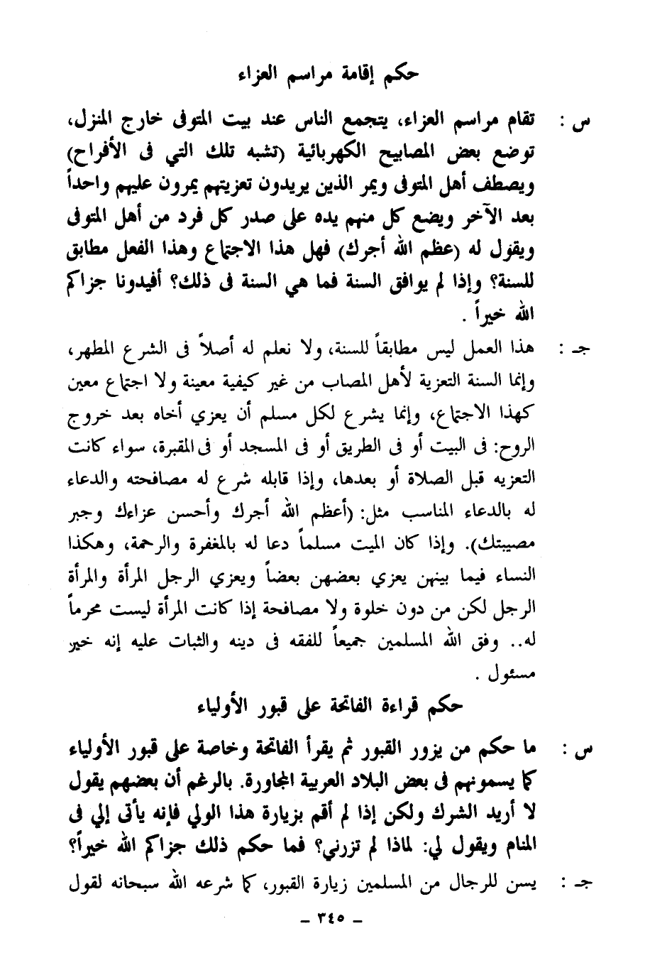 جـ هذا العمل ليس مطابقا للسنة، ولا نعلم له أصلا في الشرع المطهر، وإنما السنة التعزية لأهل المصاب من غير كيفية معينة ولا اجتماع معين كهذا الاجتماع، وإنما يشرع لكل مسلم أن يعزي أخاه بعد خروج الروح في البيت أو في الطريق أو في المسجد أو في المقبرة، سواء كانت التعزية قبل الصلاة أو بعدها، وإذا قابله شرع له مصافحته والدعاء له بالدعاء المناسب مثل (أعظم الله أجرك وأحسن عزاءك وجبر مصيبتك) . وإذا كان الميت مسلما دعا له بالمغفرة والرحمة، وهكذا النساء فيما بينهن يعزي بعضهن بعضا، ويعزي الرجل المرأة والمرأة الرجل، لكن من دون خلوة ولا مصافحة إذا كانت المرأة ليست محرما له.. وفق الله المسلمين جميعا للفقه في دينه والثبات عليه، إنه خير مسئول.