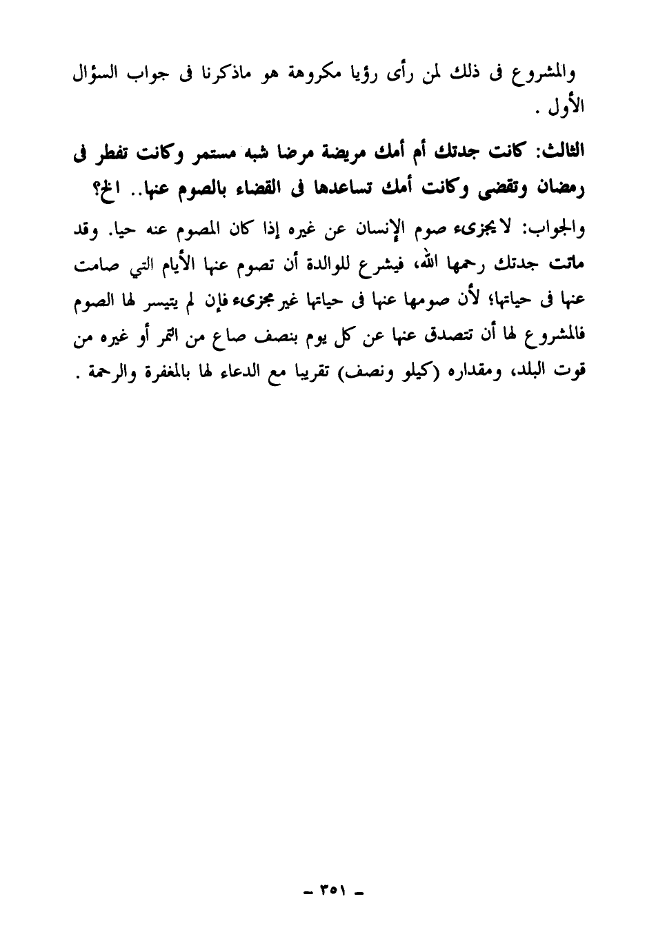 الثالث: كانت جدتك أم أمك مريضة مرضا شبه مستمر، وكانت تفطر في رمضان وتقضي، وكانت أمك تساعدها في القضاء بالصوم عنها.. إلخ؟