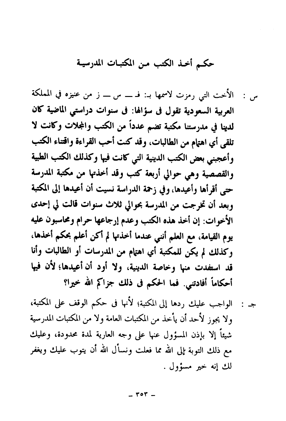 س: الأخت التي رمزت لاسمها بـ: فـ - س - ز من عنيزة في المملكة العربية السعودية تقول في سؤالها: في سنوات دراستي الماضية كان لدينا في مدرستنا مكتبة تضم عددا من الكتب والمجلات، وكانت لا تلقى أي اهتمام من الطالبات، وقد كنت أحب القراءة واقتناء الكتب، وأعجبني بعض الكتب الدينية التي كانت فيها وكذلك الكتب الطبية والقصصية، وهي حوالي أربعة كتب، وقد أخذتها من مكتبة المدرسة حتى أقرأها وأعيدها، وفي زحمة الدراسة نسيت أن أعيدها إلى المكتبة، وبعد أن تخرجت من المدرسة بحوالي ثلاث سنوات قالت لي إحدى الأخوات: إن أخذ هذه الكتب وعدم إرجاعها حرام ومحاسبون عليه يوم القيامة، مع العلم أنني عندما أخذتها لم أكن أعلم بحكم أخذها، وكذلك لم يكن للمكتبة أي اهتمام من المدرسات أو الطالبات، وأنا قد استفدت منها وخاصة الدينية، ولا أود أن أعيدها؛ لأن فيها أحكاما أفادتني. فما الحكم في ذلك جزاكم الله خيرا؟