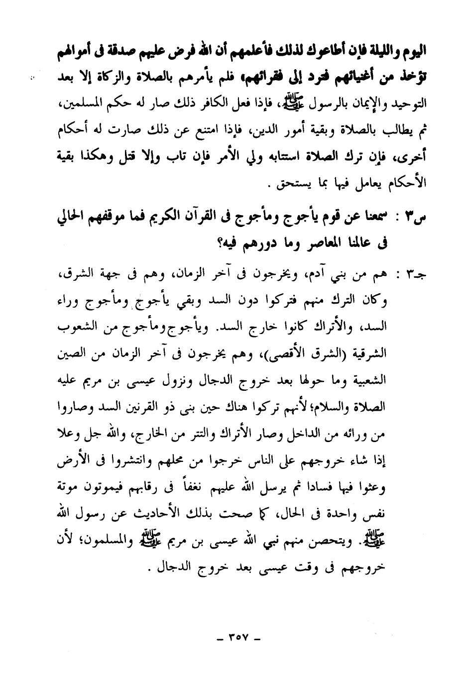 جـ3: هم من بني آدم، ويخرجون في آخر الزمان، وهم في جهة الشرق، وكان الترك منهم فتركوا دون السد وبقي يأجوج ومأجوج وراء السد، والأتراك كانوا خارج السد، ويأجوج ومأجوح من الشعوب الشرقية (الشرق الأقصى) ، وهم يخرجون في آخر الزمان من الصين الشعبية وما حولها بعد خروج الدجال ونزول عيسى ابن مريم عليه الصلاة والسلام؛ لأنهم تركوا هناك حين بنى ذو القرنين السد وصاروا من ورائه من الداخل وصار الأتراك والتتر من الخارج، والله جل وعلا إذا شاء خروجهم على الناس خرجوا من محلهم وانتشروا في الأرض، وعثوا فيها فسادا، ثم يرسل الله عليهم نغفا في رقابهم فيموتون موتة نفس واحدة في الحال، كما صحت بذلك الأحاديث عن رسول الله صلى الله عليه وسلم، ويتحصن منهم نبي الله عيسى بن مريم صلى الله عليه وسلم والمسلمون؛ لأن خروجهم في وقت عيسى بعد خروج الدجال.