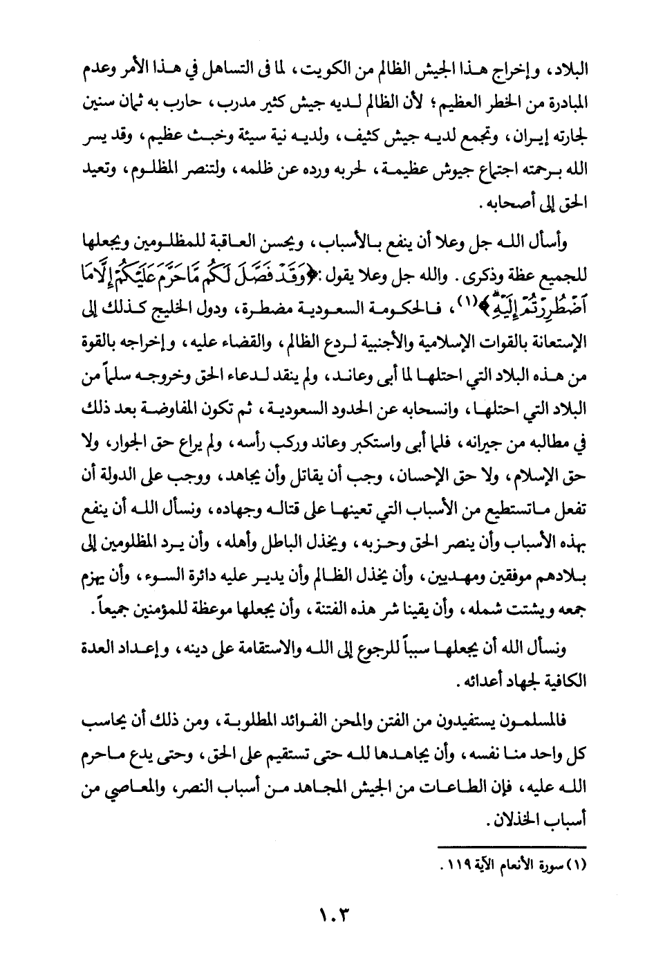 البلاد، وإخراج هذا الجيش الظالم من الكويت، لما في التساهل في هذا الأمر وعدم المبادرة من الخطر العظيم؛ لأن الظالم لديه جيش كثير مدرب، حارب به ثمان سنين لجارته إيران، وتجمع لديه جيش كثيف، ولديه نية سيئة وخبث عظيم، وقد يسر الله برحمته اجتماع جيوش عظيمة، لحربه ورده عن ظلمه، ولتنصر المظلوم، وتعيد الحق إلى أصحابه.