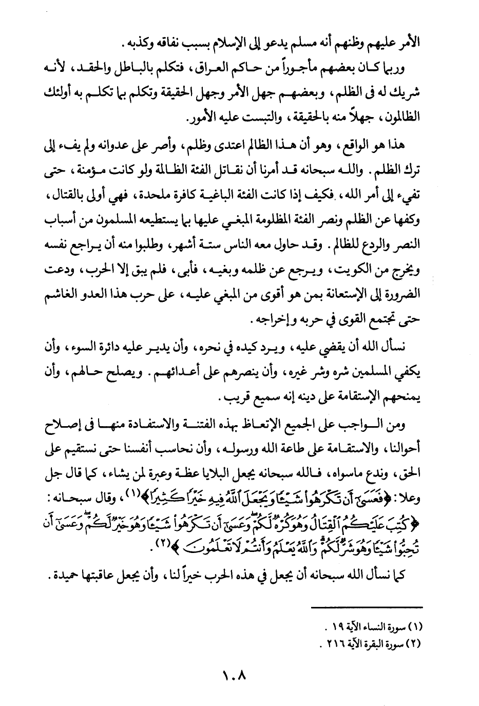 هذا هو الواقع، وهو أن هذا الظالم اعتدى وظلم، وأصر على عدوانه ولم يفئ إلى ترك الظلم. والله سبحانه قد أمرنا أن نقاتل الفئة الظالمة ولو كانت مؤمنة، حتى تفيء إلى أمر الله، فكيف إذا كانت الفئة الباغية كافرة ملحدة، فهي أولى بالقتال، وكفها عن الظلم ونصر الفئة المظلومة المبغي عليها بما يستطيعه المسلمون من أسباب النصر والردع للظالم. وقد حاول معه الناس ستة أشهر، وطلبوا منه أن يراجع نفسه ويخرج من الكويت، ويرجع عن ظلمه وبغيه، فأبى، فلم يبق إلا الحرب، ودعت الضرورة إلى الاستعانة بمن هو أقوى من المبغي عليه، على حرب هذا العدو الغاشم حتى تجتمع القوى في حربه وإخراجه.